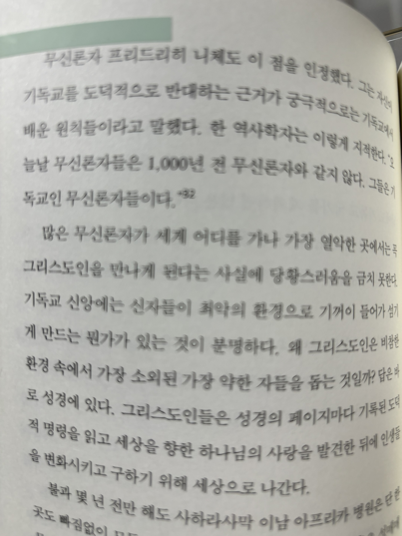 “무신론자 프리드리히 니체도 (…) 기독교를 도덕적으로 반대하는 근거가 궁극적으로는 기독교에서 배운 원칙들이라고 말했다.“ _p.126