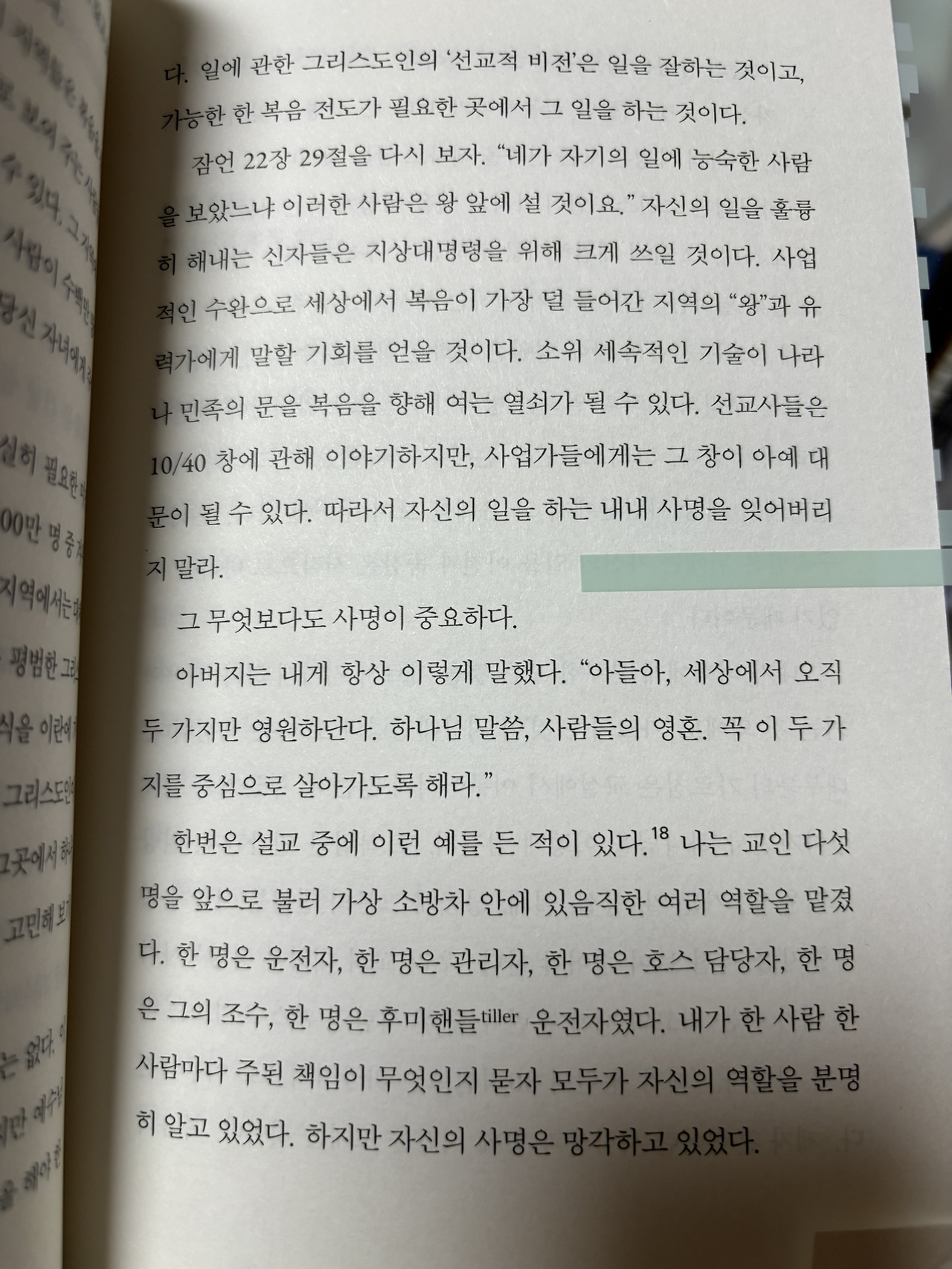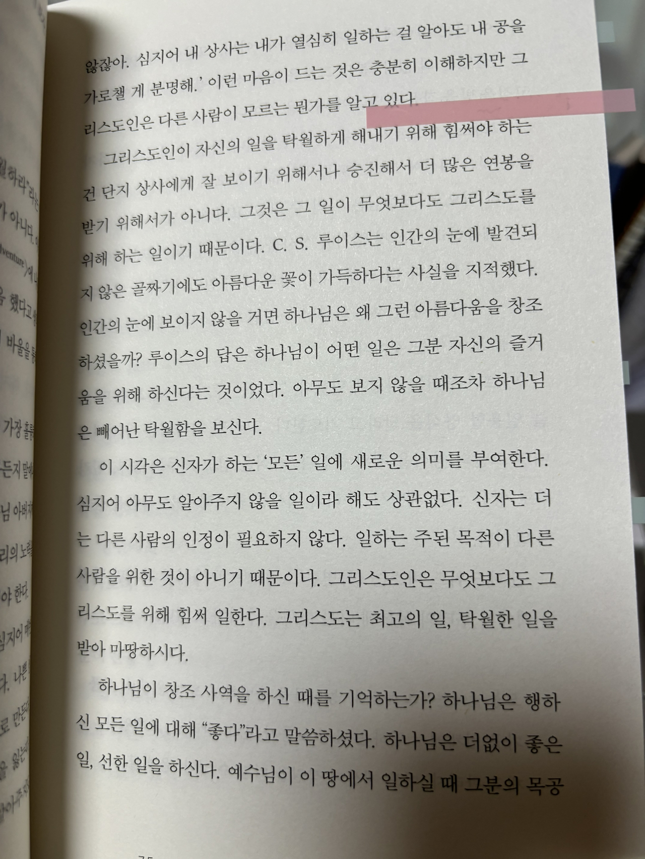 누구든 그렇지만 특히 ”그리스도인들은 자신이 맡은 일을 최선을 다해서 해내야 한다. 그것은 상사에게 잘 보이기 위해서도 아니고, 보다 더 나은 연봉을 위해서도 아니다. ‘그것은 그 일이 무엇보다도 그리스도를 위해 하는 일이기 때문이다.“ _p.75
