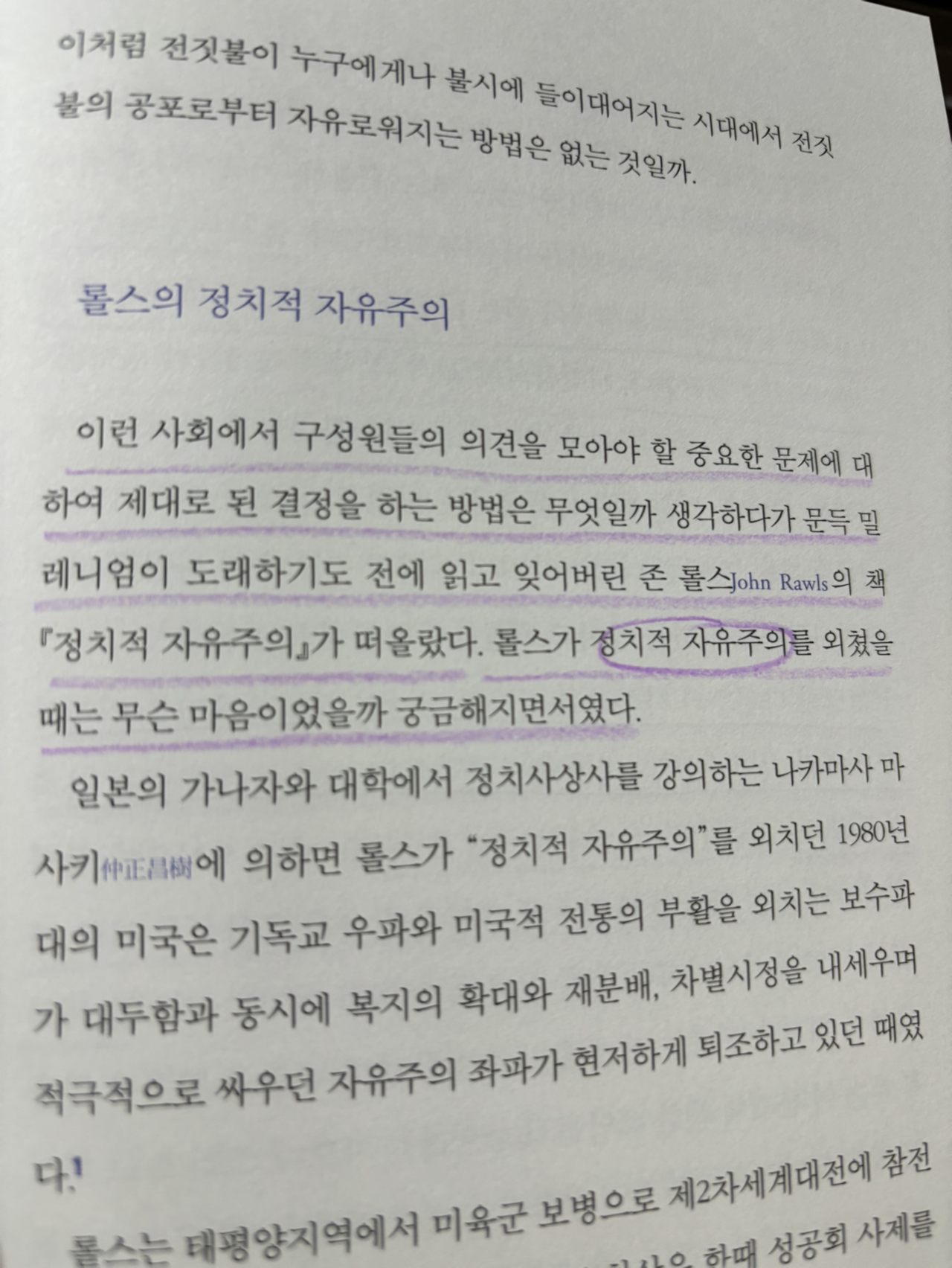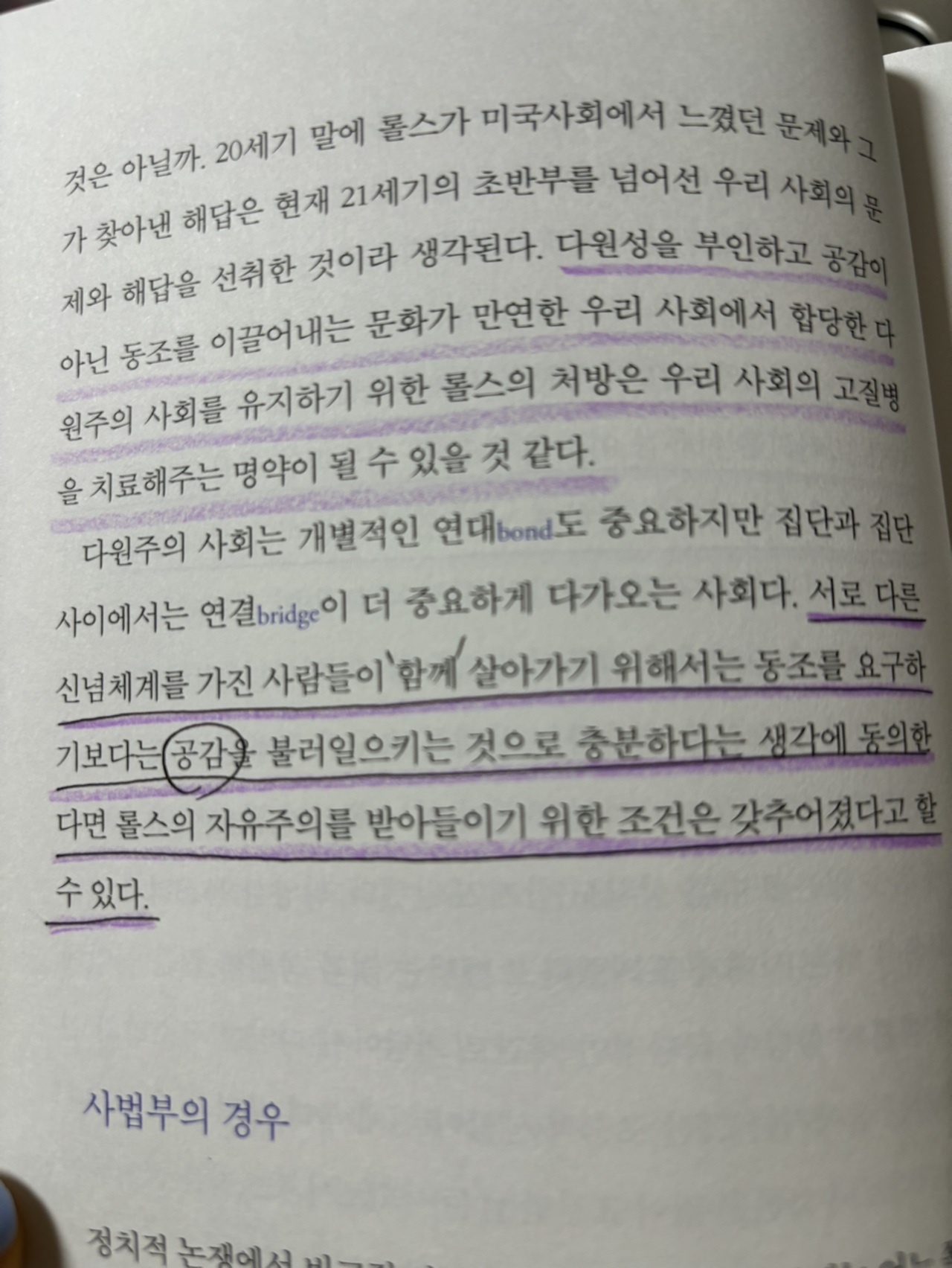 “다원주의 사회는 개별적인 연대 bond도 중요하지만 집단과 집단 사이에서는 연결 bridge이 더 중요하게 다가오는 사회다. 서로 다른 신념체계를 가진 사람들이 함께 살아가기 위해서는 동조를 요구하기보다는 공감을 불러일으키는 것으로 충분하다는 생각에 동의한다면 롤스의 자유주의를 받아들이기 위한 조건은 갖추어졌다고 할 수 있다.”