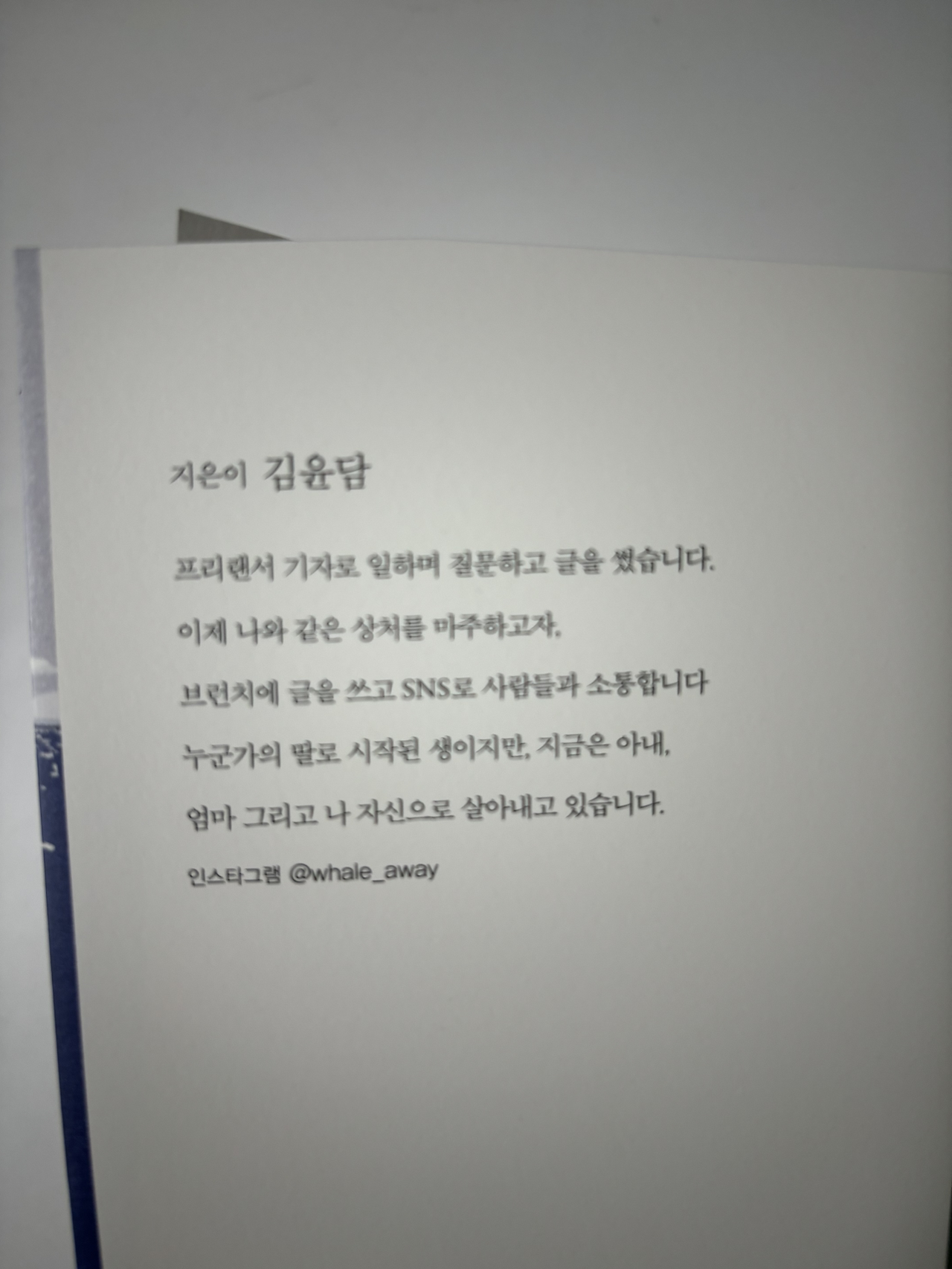 이 작가분이 기자님이시네요. 자신을 내어 보이며 글을 쓴다는 건 정말 쉽지 않은 선택과 결정 같습니다. 아참, 이 작가분의 인스타 주소가 ‘whale’ 이 들어가요. 저도 고래를 좋아하는데 동물은 다 좋아하는 것 같습니다만,, 한참 고래 영상을보고 있던 기억이 납니다. @whale_away