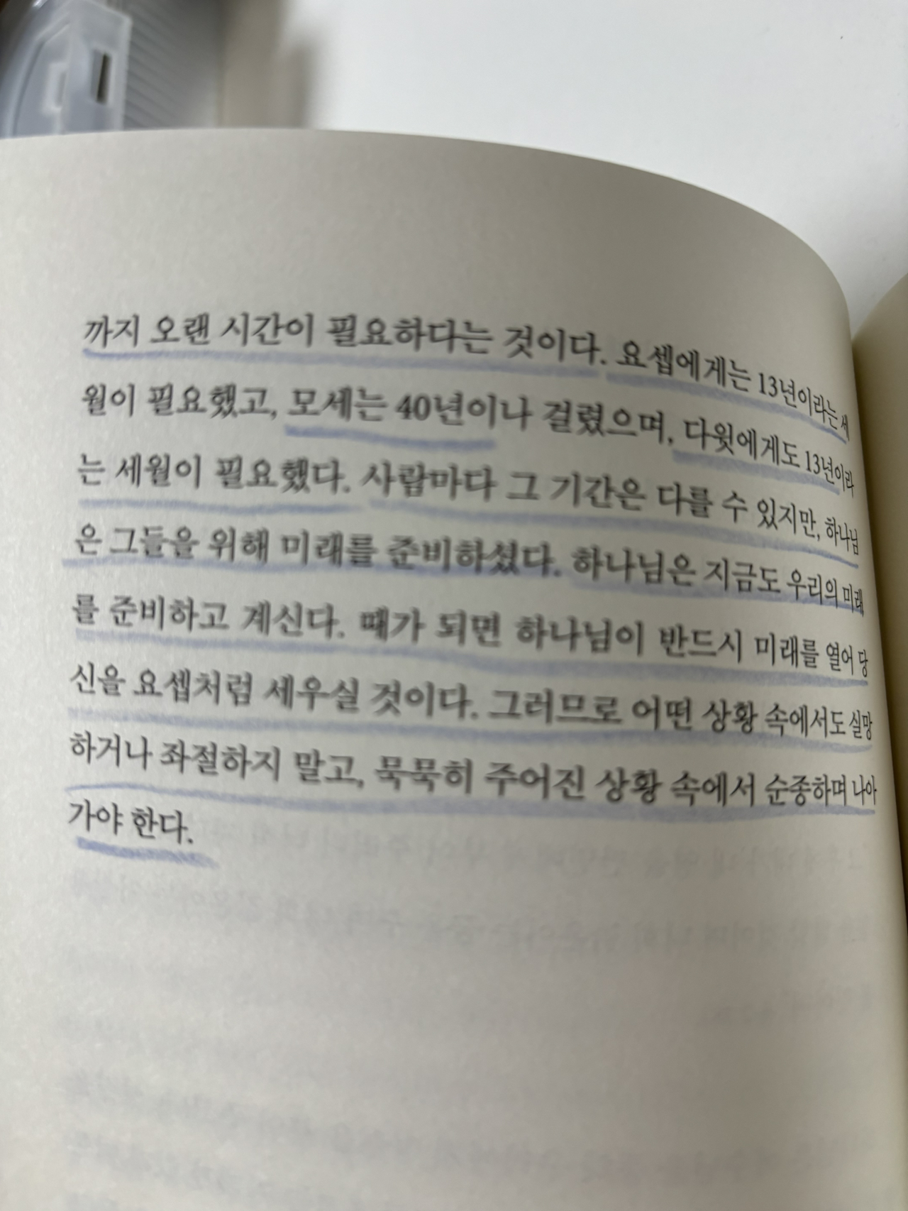 하나님이 미래를 여시기까지 오랜 시간이 필요하다는 것이다. 요셉에게는 13년이라는 세월이 필요했고, 모세는 40년이나 걸렸으며, 다윗에게도 13년이라는 세월이 필요했다. 사람마다 그 기간은 다를 수 있지만, 하나님은 그들을 위해 미래를 준비하셨다. 하나님은 지금도 우리의 미래를 준비하고 계신다. 때가 되면 하나님이 반드시 미래를 열어 당신을 요셉처럼 세우실 것이다. 그러므로 어떤 상황 속에서도 실망하거나 좌절하지 말고, 묵묵히 주어진 상황 속에서 순종하며 나아가야 한다.” _p.118