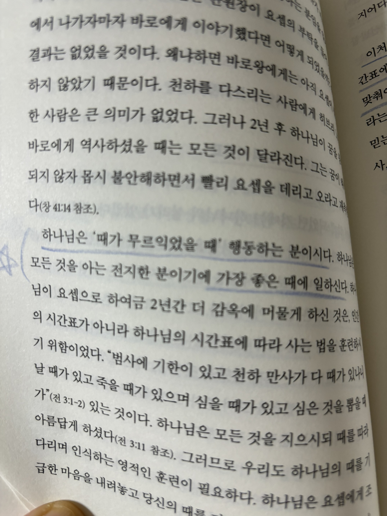 “하나님은 ‘때가 무르익었을 때’ 행동하시는 분이시다. 하나님은 모든 것을 아는 전지한 분이기에 가장 좋은 때에 일하신다.“ _p.102