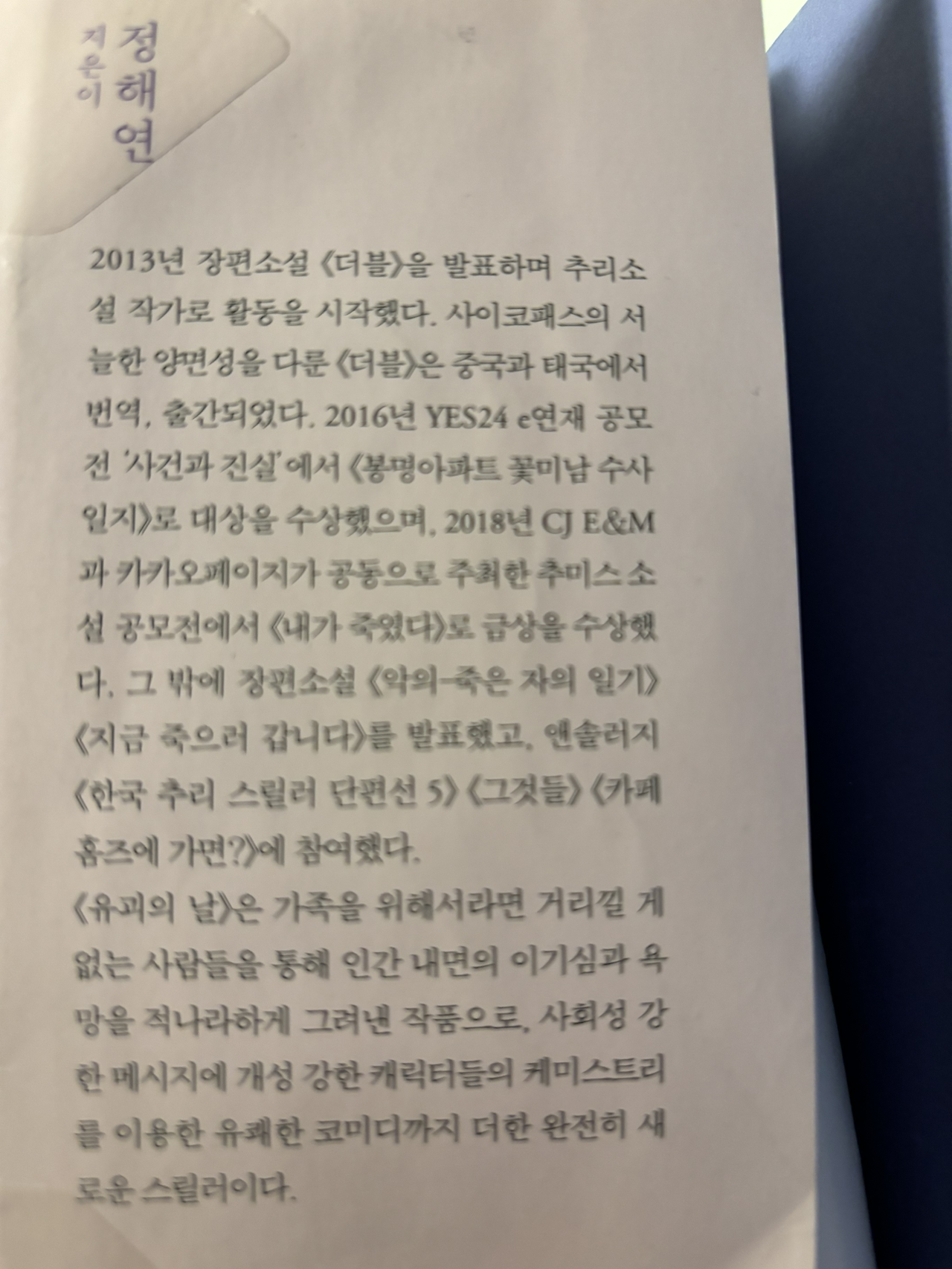 이 책의 저자인 정해인 작가 분은 2013년 추리소설 <더블>로 작가 활동을 시작했다고 합니다. 대부분 스릴러 물들을 발표하신 거 같아요.