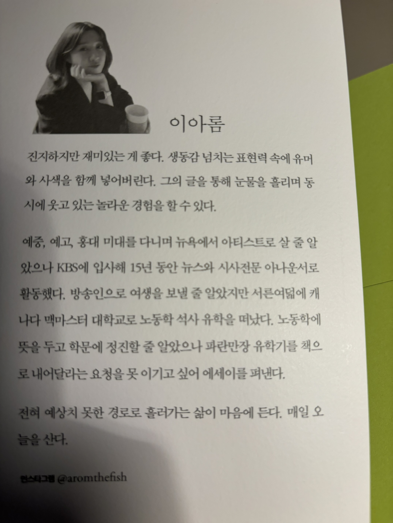 아참, 이 작가 분은 KBS 아나운서에, 쌍둥이 그것도 아들 둘을 데리고 캐나다로 대학원 공부를 하러 유학을 다녀오셨더랬어요. 작가분 인스타 주소는 @aromthefish 에요.