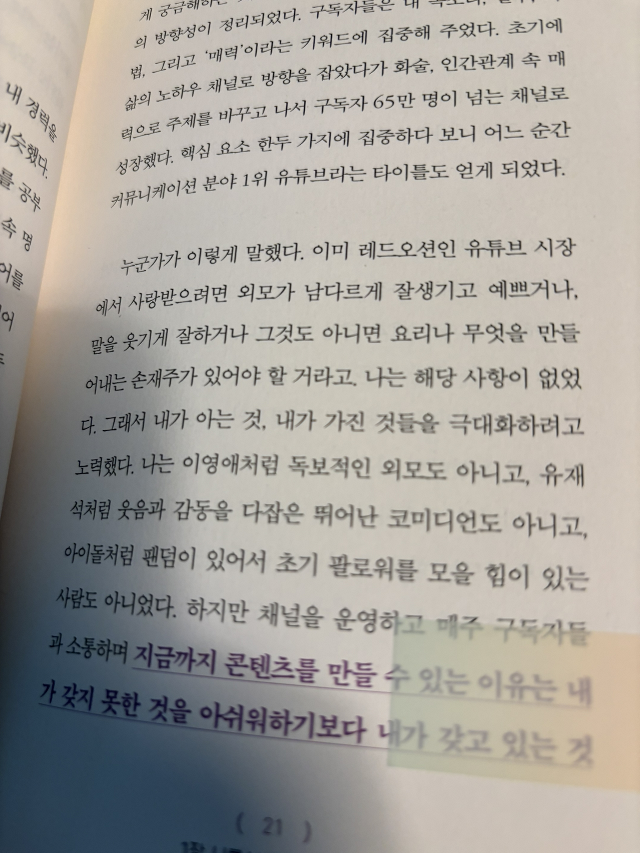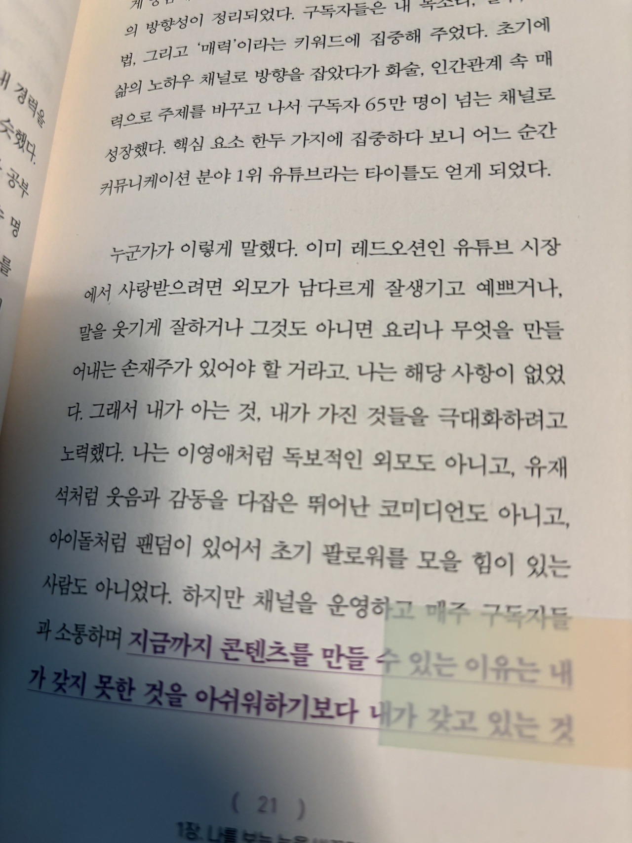 이 책을 읽는 초반에는 ‘나’를 찾아라,라고 느껴졌어요. 나 나 나, 이러며 읽었고 그다음에는 너무 많은 플래그와 사진들을 찍었지만 주제에 관심이 있으면 읽어 보세요. 이 책도 후루룩 읽혀요. 거기다 챕터마다 축약 정리본이 있어서 아주 쉽게 읽힙니다.