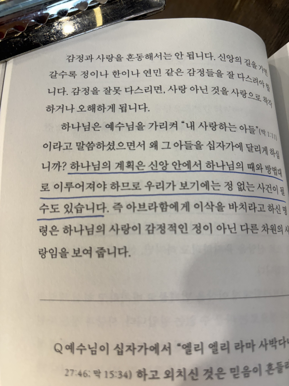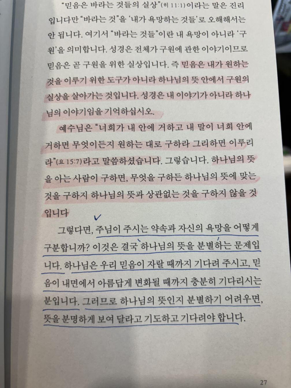 “주님이 주시는 약속과 자신의 욕망을 어떻게 구분합니까? 이것은 결국 하나님의 뜻을 분별하는 문제입니다. 하나님은 우리 믿음이 자랄 때까지 기다려 주시고, 믿음이 내면에서 아름답게 변화될 때까지 충분히 기다리시는 분입니다. 그러므로 하나님의 뜻인지 분별하기 어려우면, 뜻을 분명하게 보여 달라고 기도하고 기다려야 합니다.