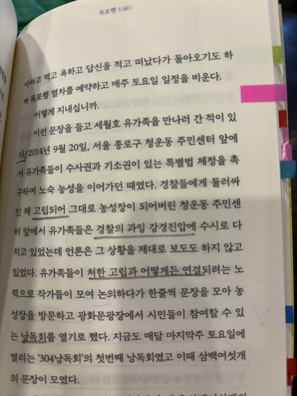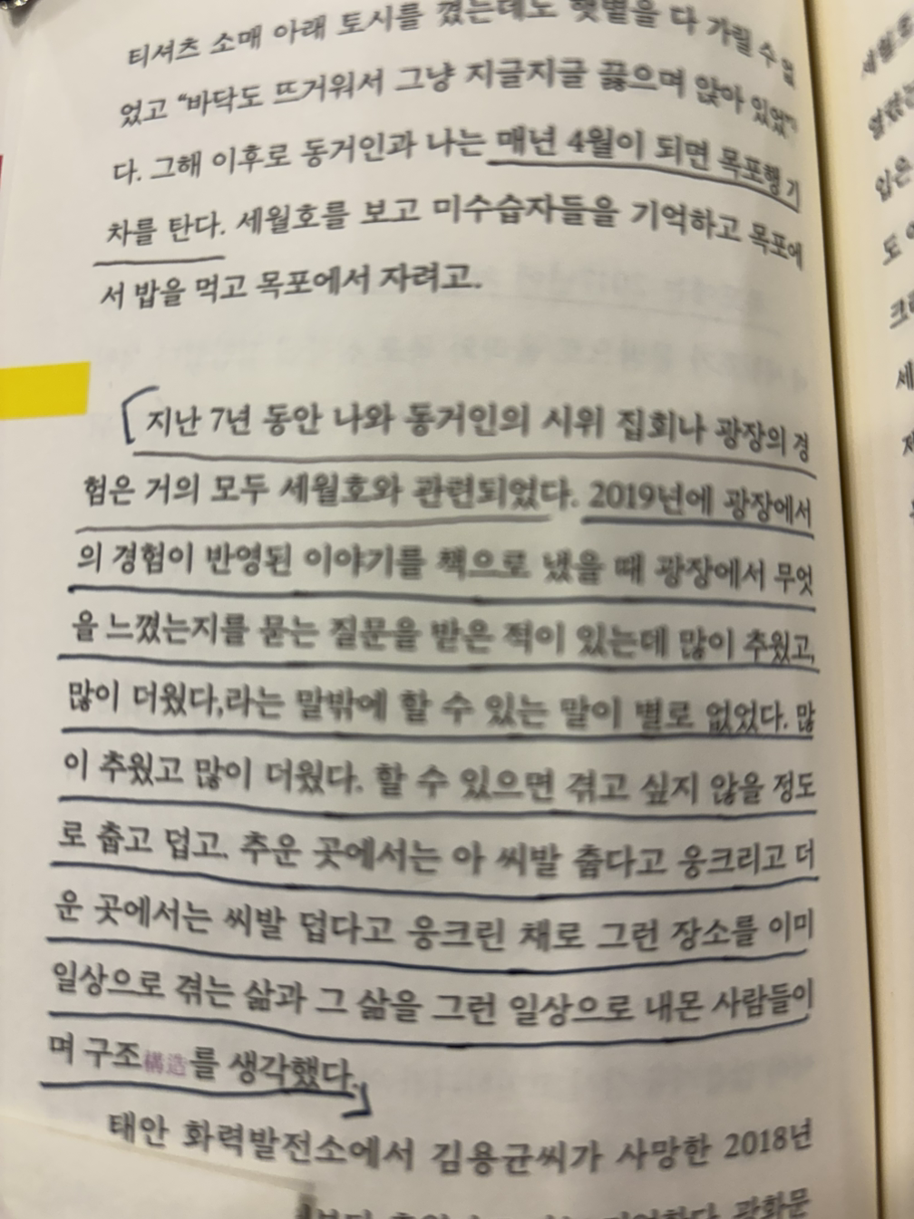 지난 7년 동안 나와 동거인의 시위 집회나 광장의 경험은 거의 모두 세월호와 관련되었다. 2019년에 광장에서의 경험이 반영된 이야기를 책으로 냈을 때 광장에서 무엇을 느꼈는지를 묻는 질문을 받은 적이 있는데 많이 추웠고, 많이 더웠다,라는 말밖에 할 수 있는 말이 별로 없었다. 많이 추웠고 많이 더웠다. 할 수 있으면 겪고 싶지 않을 정도로 춥고 덥고, 추운 곳에서는 아 씨발 춥다고 웅크리고 더운 곳에서는 씨발 덥다고 웅크린 채로 그런 장소를 이미 일상으로 겪은 삶과 그 삶을 그런 일상으로 내몬 사람들이며 구조를 생각했다.