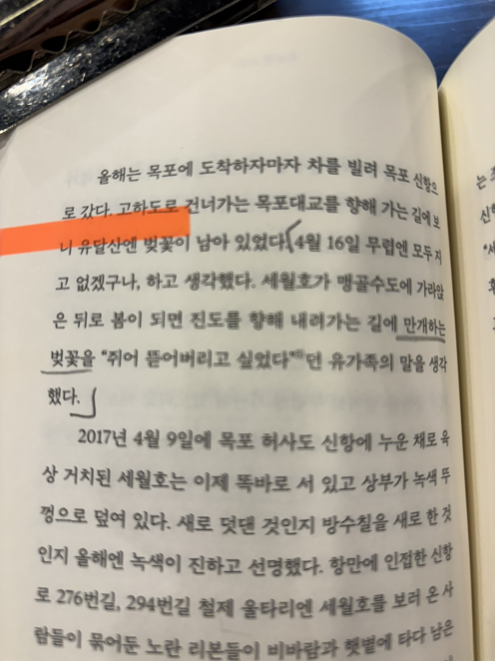 (…) 세월호가 맹골수도에 가라앉은 뒤로 봄이 되면 진도를 향해 내려가는 길에 만개하는 벚꽃을 “쥐어 뜯어버리고 싶었다”던 유가족의 말을 생각했다.