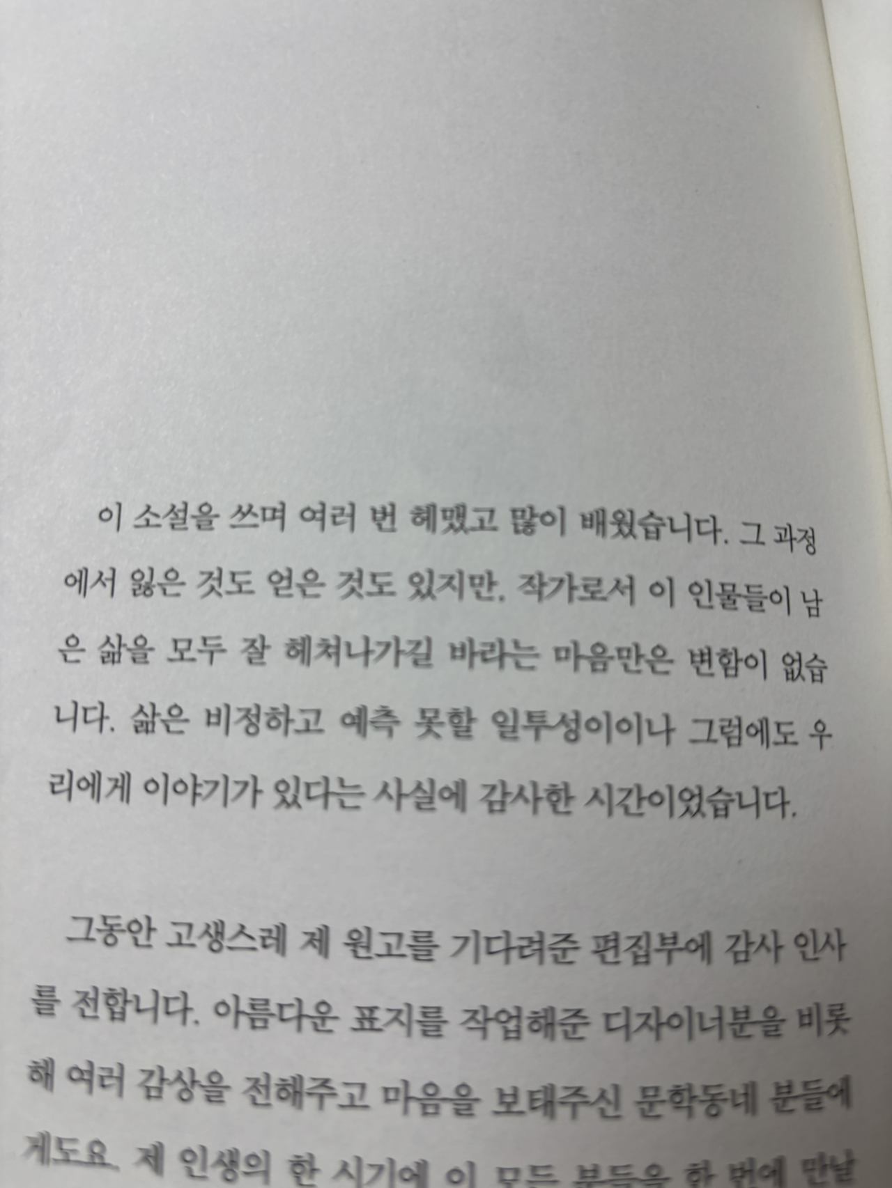 “이 소설을 쓰며 여러 번 헤맸고 많이 배웠습니다. 그 과정에서 잃은 것도 얻은 것도 있지만, 작가로서 이 인물들이 남은 삶을 모두 잘 헤쳐나가길 바라는 마음만은 변함이 없습니다. 삶은 비정하고 예측 못할 일투성이같지만 그럼에도 우리에게 이야기가 있다는 사실에 감사한 시간이었습니다.”