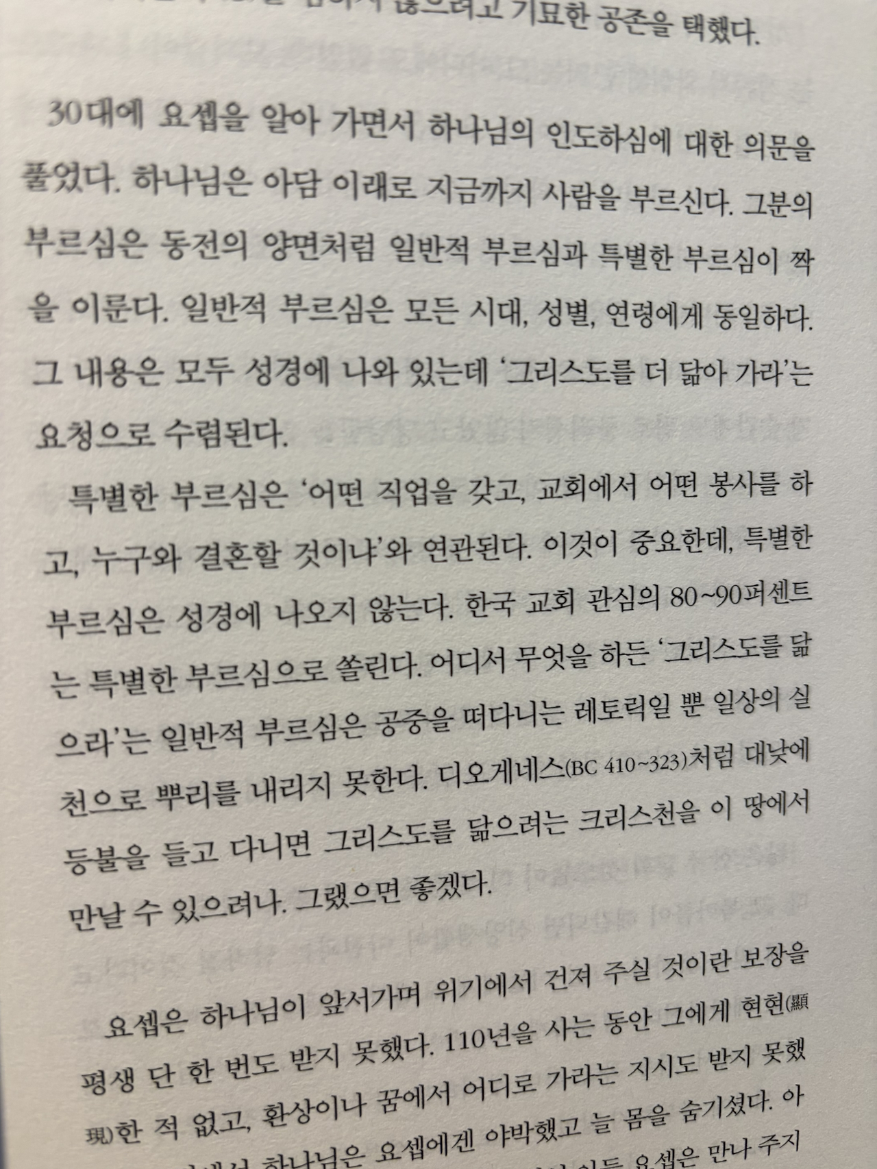 “요셉은 하나님이 앞서가며 위기에서 건져 주실 것이란 보장을 평생 단 한 번도 받지 못했다. 환상이나 꿈에서 어디로 가라는 지시도 받지 못했다. 그 면에서 하나님은 요셉에겐 야박했고 늘 몸을 숨기셨다. 아버지 야곱을 그렇게 자주 만나 주셨으면서 아들 요셉은 만나 주지 않은 하나님에게 종종 차별적이라 느끼지 않았을까.”