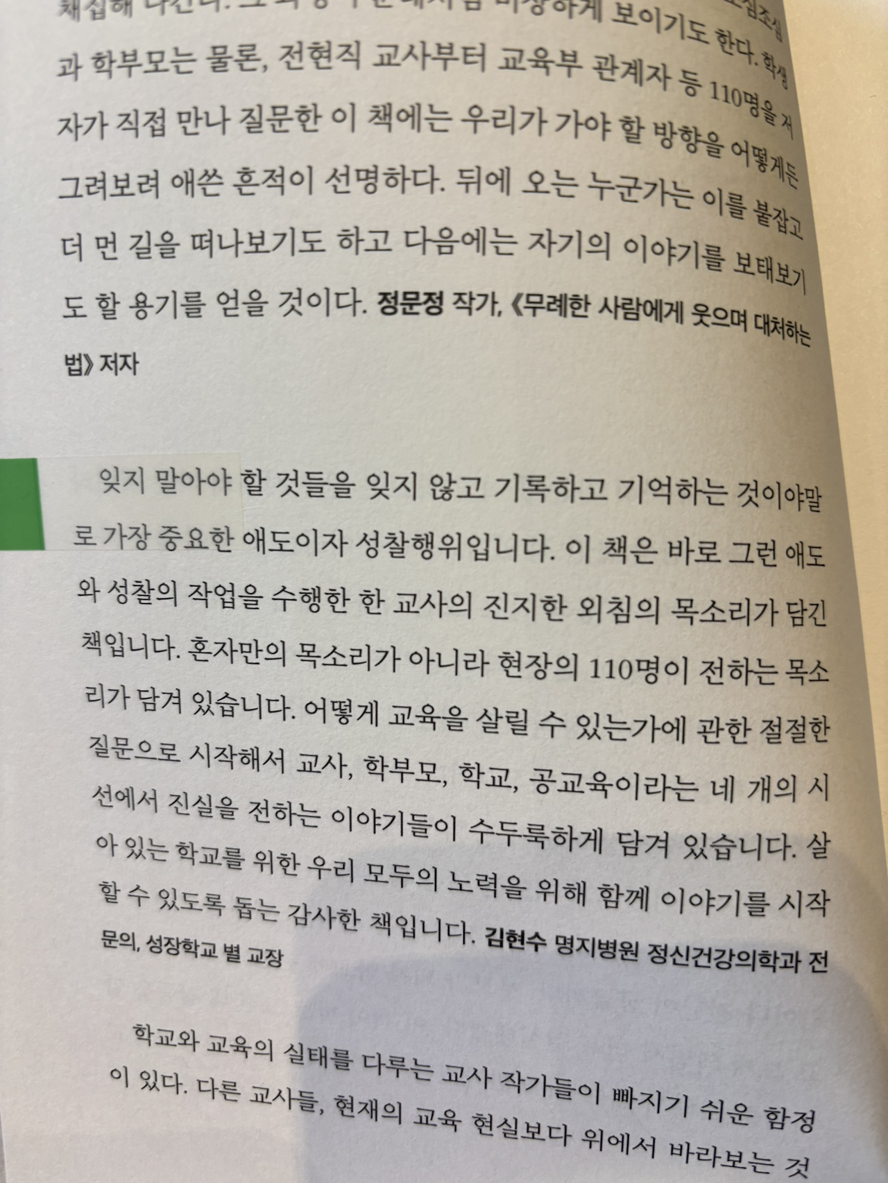 사교육을 거의 시키지 않고 아이들을 한국 공•사립초등학교부터 일반 중학교와 비인가 국제학교, 제주국제학교를 다녔던 아이들을 둔 엄마로서, 무엇보다 교사로서 교육대학원에서 배운 가르침 아래 지금 일어나는 아이들, 학교, 교사, 학원을 중심으로 일어나는 사건들을 쉽게 지나치지는 못하게 되는 것 같다.