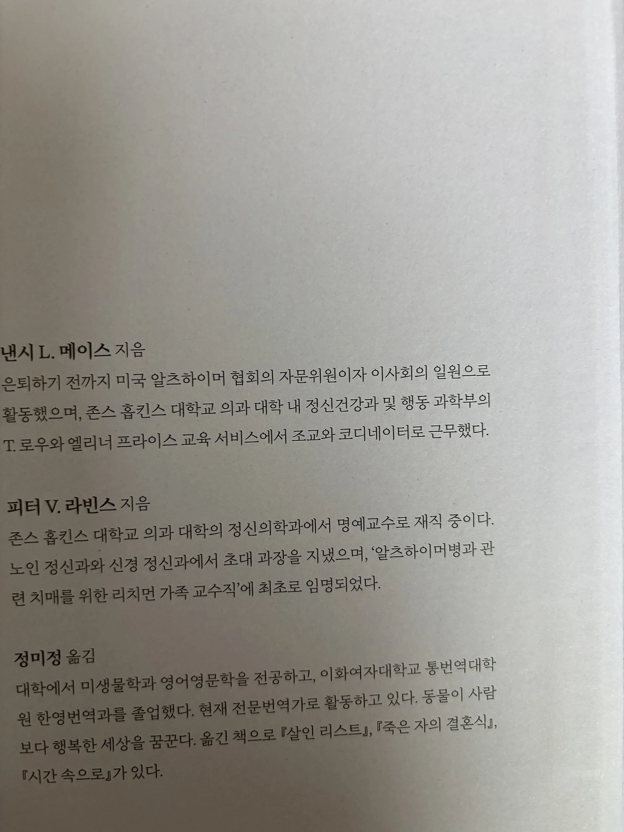 이 책은 저명한 존스합킨스의 치매로 전문가 의사분들이 자신의 경험과 연구들을 토대로 쓴 책인 것 같다.