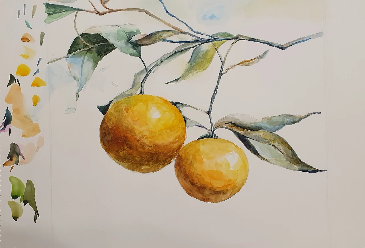 선생님과 상의해 가며 사진을 골라 그림을 그리기 시작했다. 잘 그리고 싶은 마음이 커서 붓 터치 한 번을 할 때마다 심호흡을 했다. 선생님이 시범을 보여주시면 그걸 놓치지 않으려고 집중했다. 나뭇가지에 달린 감 하나, 나뭇잎 위에 앉은 무당벌레 한 마리를 그리고도 내가 이렇게 잘 그린게 믿어지지 않아 가슴 앞에 두 손을 모으고 자뻑 시간을 갖곤 했다. 지금 다시 열어보니 겁에 질려 잔터치를 겹겹이 해놓은 그림이건만, 그게 뭐 중요한가? 그걸 그릴 때의 기분이 그 초보 시절 그림 안에 고스란히 들어있다.