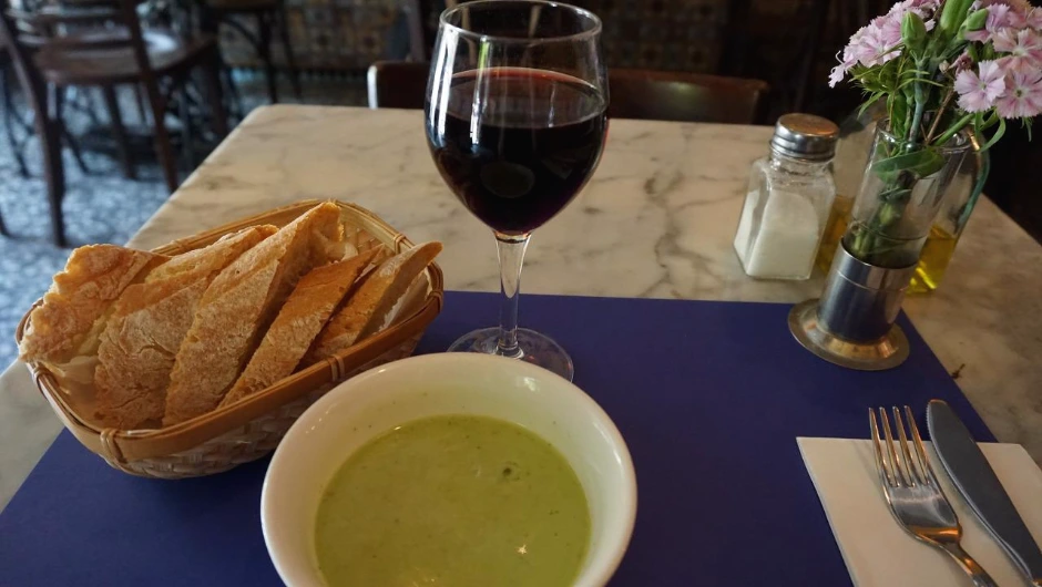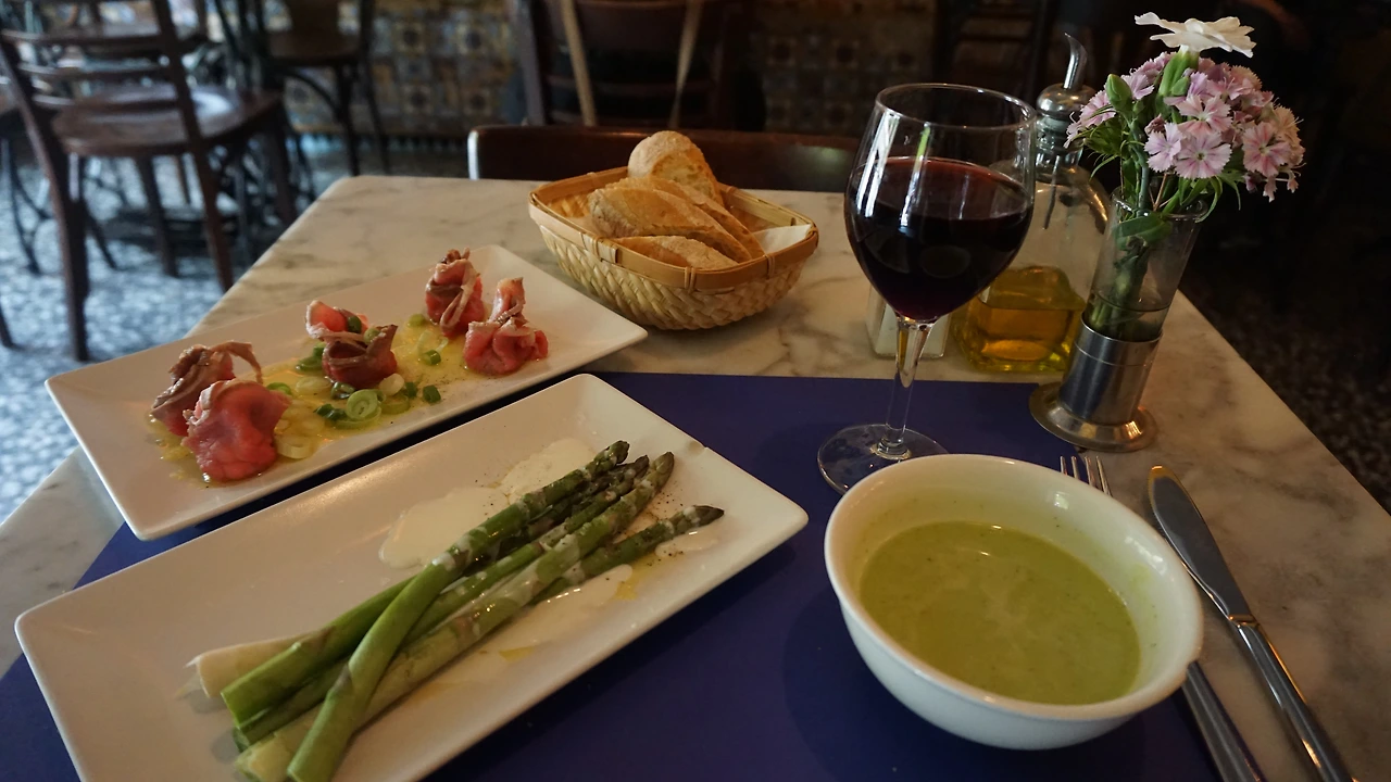 게다가 눈물 나게 맛있는 바게트 빵. 테이블마다 비치된 올리브유 몇 방울 떨어뜨려 먹으면 그렇게 맛있을 수가 없다. 와인과 빵이 이렇게 맛있는 조합이었는지 바르셀로나에서 깨달았다. 올리브유의 향이 이렇게 향긋했는지도 말이야. 이 집에서는 소고기 요리와 아스파라거스를 시켰는데 소고기가 익히지 않은 채 나와서 조금 낯설었다. 기본으로 제공되는 민트 콜드 숩은 입맛에 잘 안 맞아 그대로 남겼더니 식사를 다하고 그릇을 치우던 사장님의 눈초리를 호되게 맞아야 했다.
