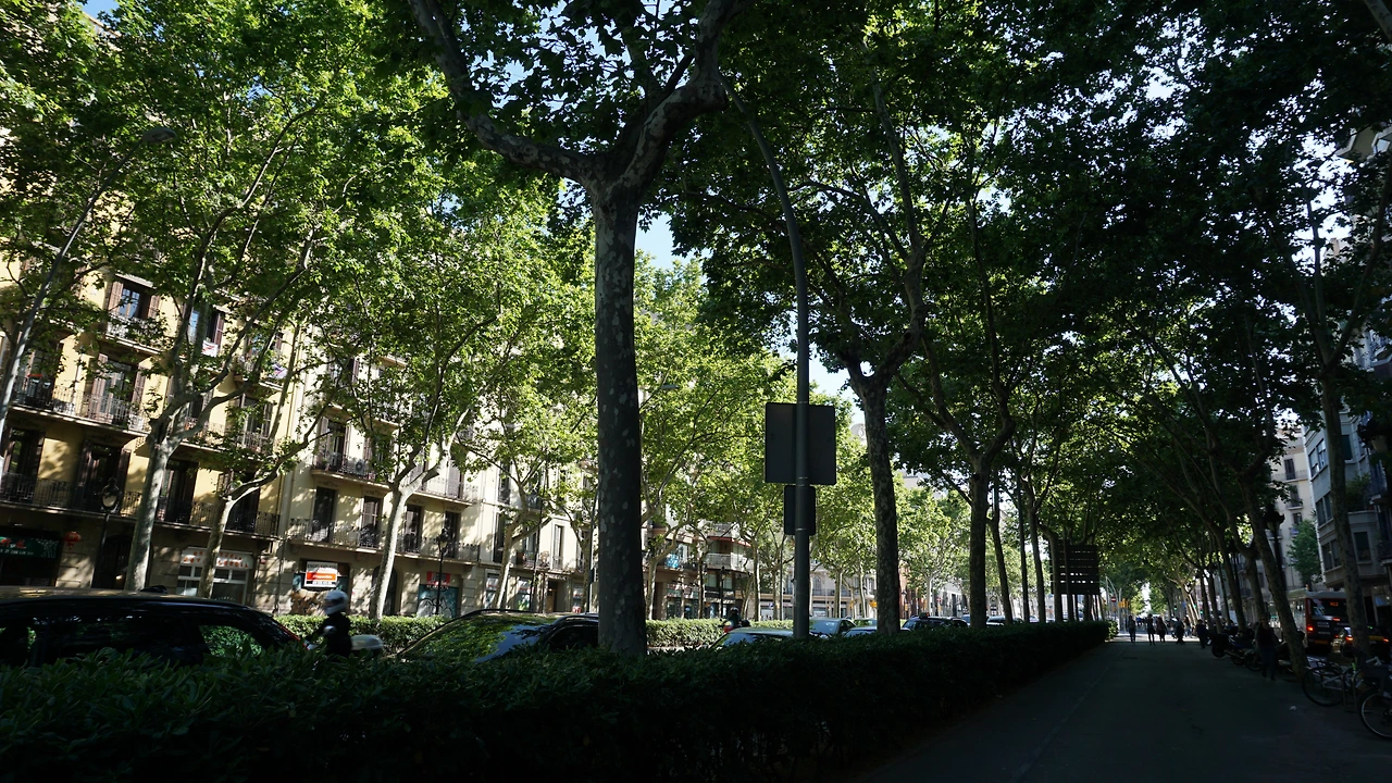 바르셀로나의 대부분의 도로는 가운데 넓은 보행도로가 따로 있다는 점. 사진에 보이는 사람들이 걷고 있는 보행로는 차로 한가운데 위치하고 있다. 그리고 그 양쪽으로 겨우 2차선 정도 되는 차로가 일방통행으로 오가고 있다. 도로 중심에 위치한 보행로는 다양한 역할을 한다. 보행자들은 누구와 부딪히거나 서두를 필요 없이 여유롭게 걸어 다니고 한켠에는 자전거 전용 도로도 따로 마련되어 있다. 줄지어 심긴 가로수는 그늘 역할을 해주며 몇 걸음에 한 개씩 벤치도 쉽게 볼 수 있다.