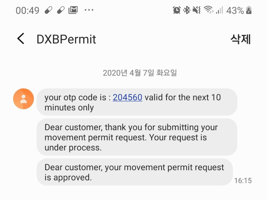 거주자 이름, 주소, 아이디 넘버 등 개인 정보와 출발지 및 도착지, 출발 시간 도착 시간 등을 기재해 퍼밋을 신청하면 보통 5-10분 내로 승인 SMS가 온다.