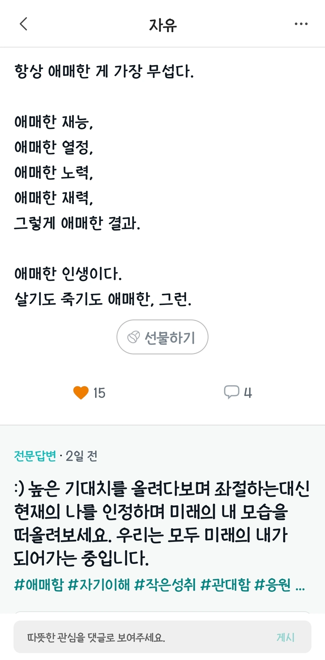 OO님이 느끼는 '애매함'은 우리 모두가 살면서 한 번쯤 겪게되는 감정입니다. 이러한 감정의 한 가운데서도 자신만의 길을 찾기 위해 노력하는 OO님이기에 그 노력 자체가 이미 의미있는 도전으로 느껴집니다. 지금의 상황을 조금씩 바꿔나가는 동시에 OO님 자신에게 더 많은 응원과 지지를 보내주세요. 기대치를 낮추려 억지로 애쓸 필요도 없습니다. 그저 지금 내 모습을 있는 그대로 바라봐 주세요. 자기수용은 자신을 있는 그대로 바라보는 것이지 무턱대고 편들어주는 것이 아닙니다.