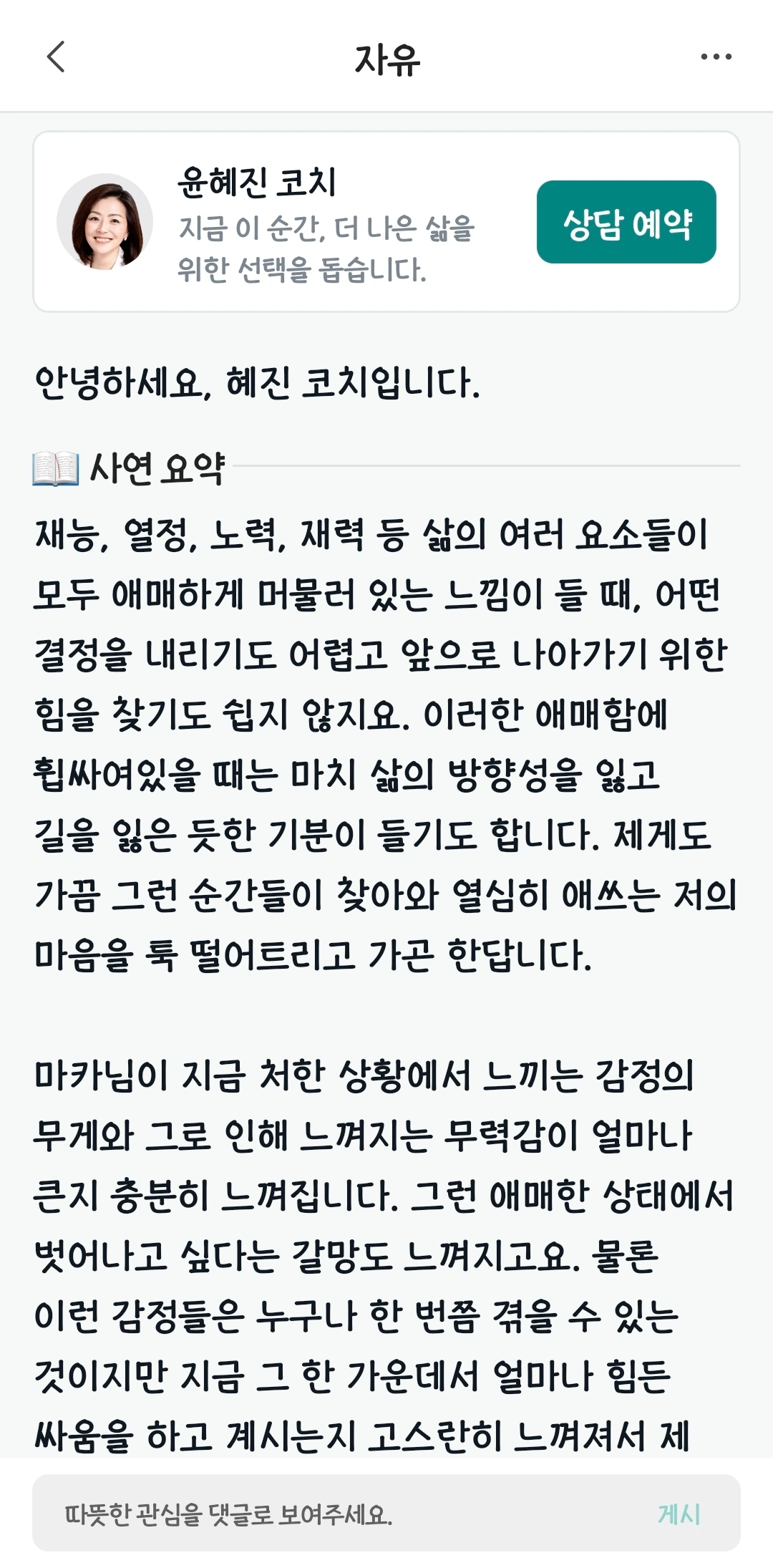 나는 고객으로부터 받은 개인적인 메시지나 카톡후기, 코칭 일지를 공개하기를 선호하는 편은 아니다. 이는 어디까지나 우리끼리의 대화라는 암묵적인 약속이고, 비트윈 세션between session에서도 당연히 지켜져야 할 비밀 보장의 원칙이기도 하다.