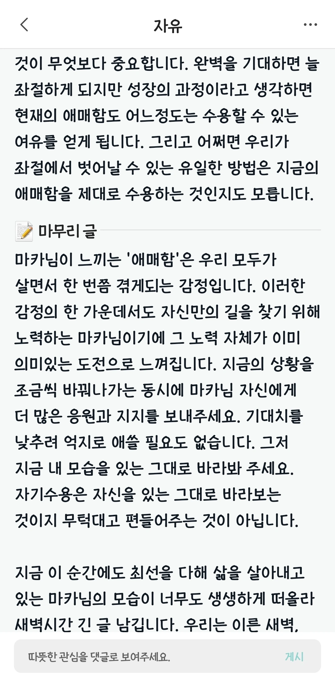 지금 이 순간에도 최선을 다해 삶을 살아내고 있는 OO님의 모습이 떠올라 새벽시간 긴 글 남깁니다. 우리는 이른 새벽, 같은 시간에 깨어있군요. 저도 OO님과 함께 이 여정을 걷고 있음을 기억해주세요. 더불어, OO님의 용기를 진심으로 응원드립니다.