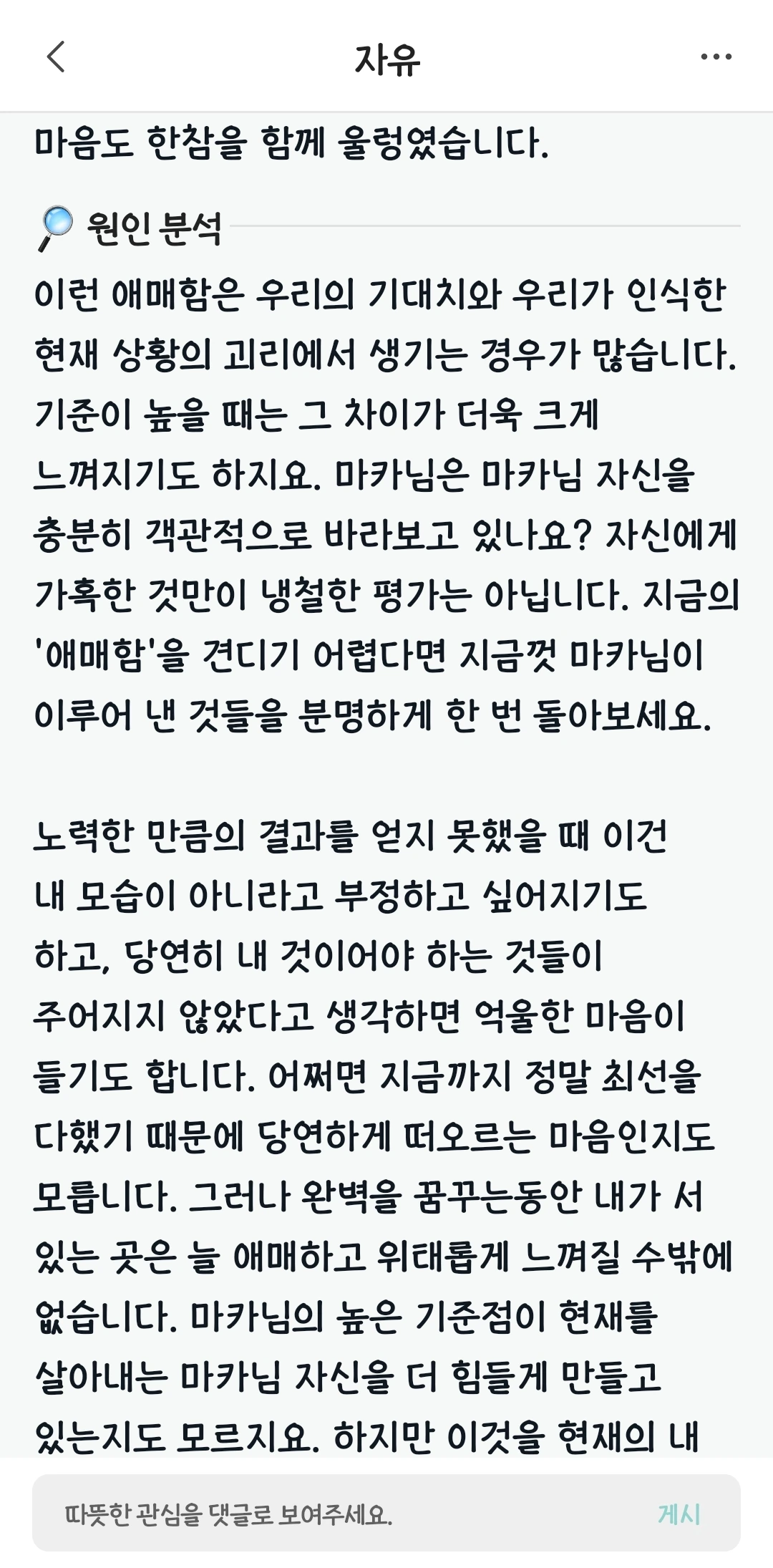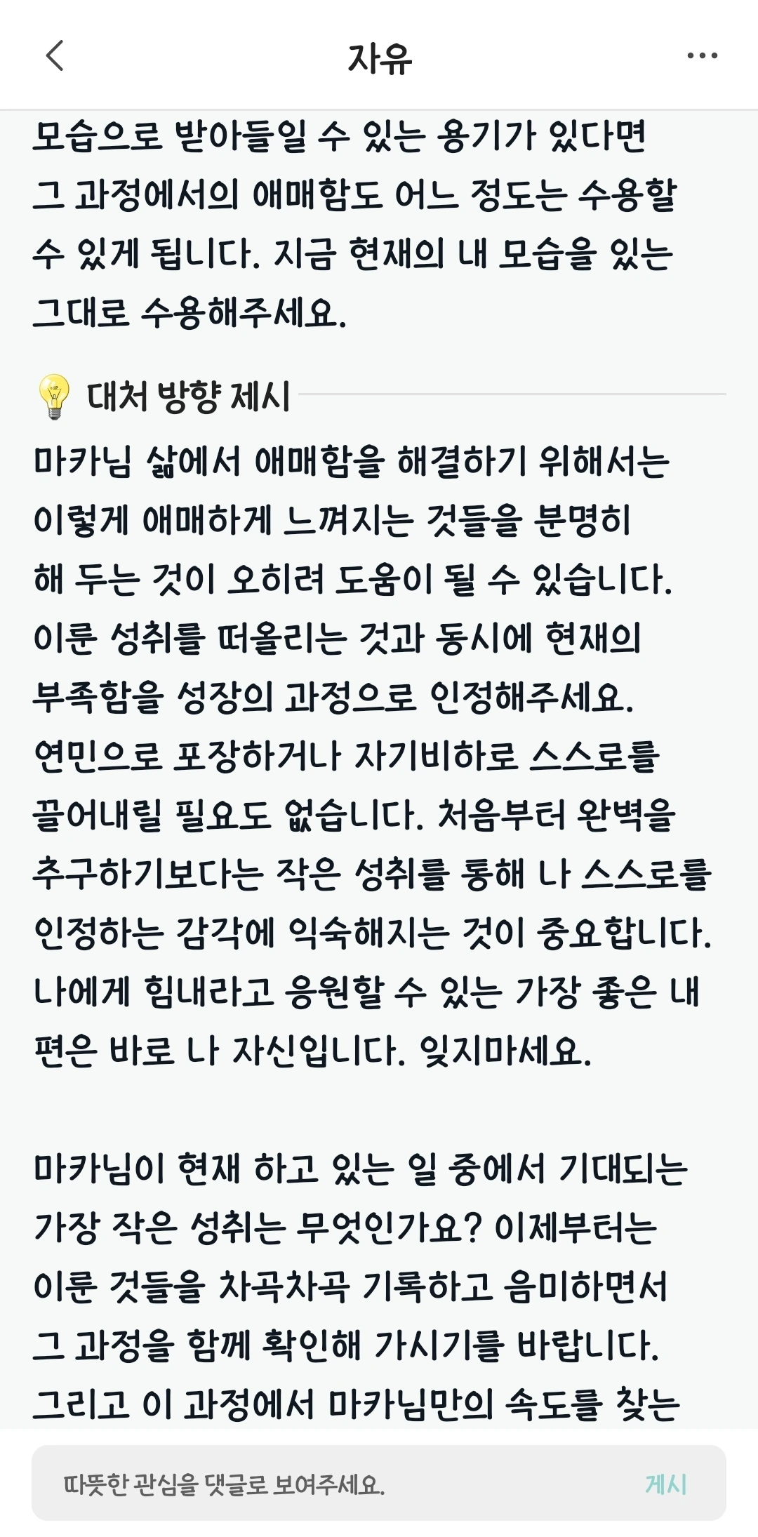 OO님이 현재 하고 있는 일 중에서 기대되는 가장 작은 성취는 무엇인가요? 이제부터는 이룬 것들을 차곡차곡 기록하고 음미하면서 그 과정을 함께 확인해 가시기를 바랍니다. 그리고 이 과정에서 OO님만의 속도를 찾는 것이 무엇보다 중요합니다. 완벽을 기대하면 늘 좌절하게 되지만 성장의 과정이라고 생각하면 현재의 애매함도 어느정도는 수용할 수 있는 여유를 얻게 됩니다. 그리고 어쩌면 우리가 좌절에서 벗어날 수 있는 유일한 방법은 지금의 애매함을 제대로 수용하는 것인지도 모릅니다.