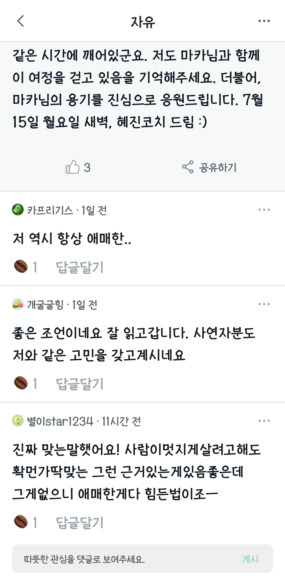 여기에는 자세한 사연이 담긴 글도 있고 애매한 단어나 문장, 가끔은 도배된 이모지로 그 힘든 마음만 겨우 미루어 짐작할만한 글도 있다. 스크롤을 내리면서 나는 이따금씩 내가 아는 누군가를 떠올리기도 하고, 혹시 누군가 오래전 내 일기장을 주워다 베껴 쓴 것은 아닐까... 얼굴이 화끈거릴 만큼 익숙한 문장을 발견하기도 한다.