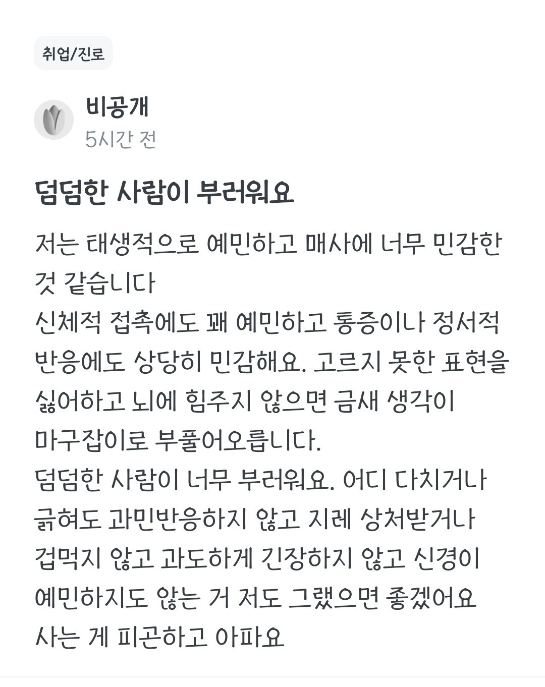 오래전 인류는 환경의 작은 변화에도 민감해야 생존할 수 있었습니다. 사소한 소리나 움직임도 생사를 가를 수 있는 위험 신호였으니까요. 예민함은 어쩌면 위협으로부터 살아남은 인류의 강한 유전자를 의미하는 것일지도 모릅니다 :)