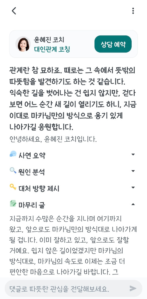 코치에게 솔직한 감정을 슬쩍 털어놓아 보는 것도 좋은 시작입니다. 의외로 코치와의 대화에서도 솔직해지기를 어려워하는 경우가 많습니다. 생각해보면 너무도 당연한 일이지요. 그래서 코칭대화의 80%의 에너지는 '시작'에 쓰입니다. 무튼 그게 어떤 형태이든, 부담 없이 내 이야기를 시작할 수 있는 방법을 찾는다면 마카님에게 맞는 소통 방식을 찾게 되고, 거기서부터 삶으로 서서히 넓혀나가면 됩니다.
