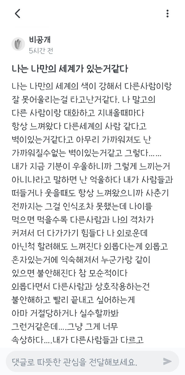 오랜 친구에게 가볍게 연락을 해보거나. 새로운 취미를 시도해 보는 것도 좋은 시작이 되죠. 부담 없이 다가갈 수 있는 관계부터 천천히 만들어가는 것이 중요합니다. 나와 결이 맞는 사람을 찾는 데는 당연히 시간이 걸릴 수밖에 없지만 마카님의 생각과 삶의 방식을 이해하고 존중해 줄, 그리고 함께 나누기를 기다리는 누군가가 분명히 있습니다.