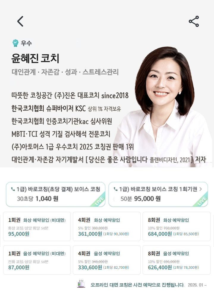 코칭은 고객과 코치가 함께 성장하는 여정입니다. 저 역시 꾸준히 되어가는 중이니 이 말은 제게도 늘 큰 위안이 되고요. 함께하는 모두가 서로의 성장을 응원하며 든든한 동반자로 오래 오래 함께이길 바랍니다.