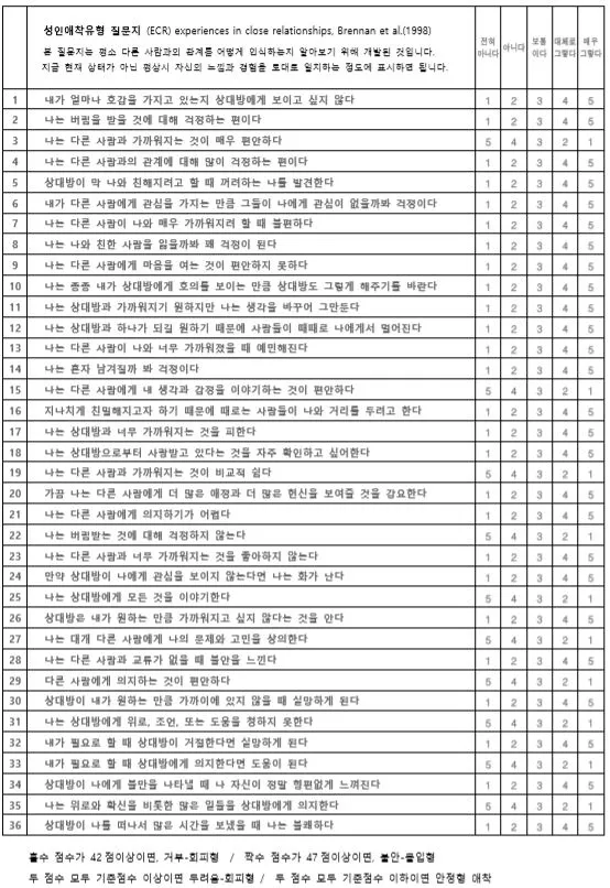 자신의 애착유형을 확인할 수 있는 질문지를 맨 아래 부록으로 삽입하였다. 경험을 토대로 문항에 답하고, 결과에 따라 해석하면 된다. 질문지는 ECR(experiences in close relationships, Brennan et al.(1998)을 번역하였다.