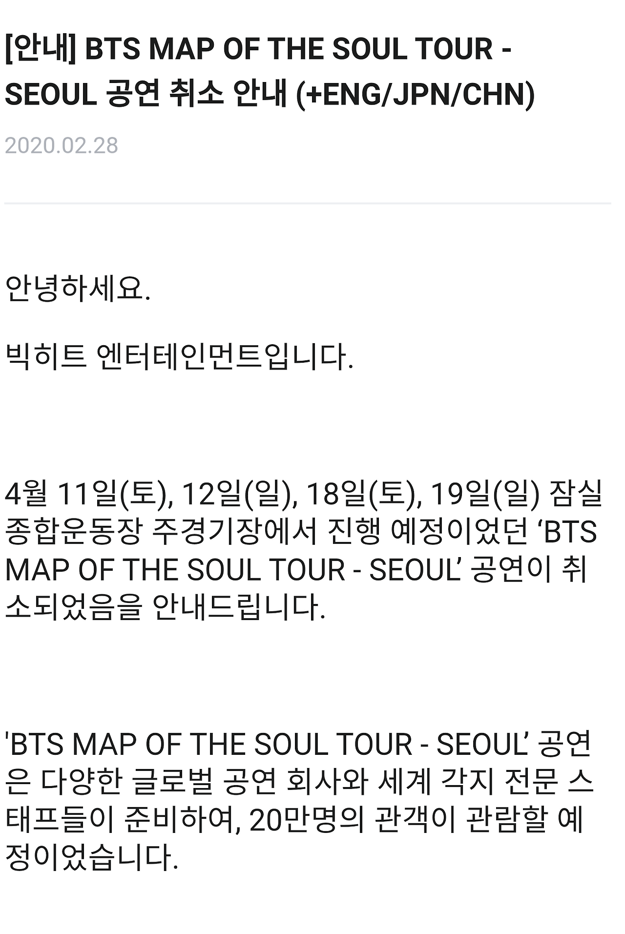 방탄소년단의 컴백을 앞둔 지난 두어 달 내가 느꼈던 설렘과 두근거림, 그리고 이십만 명 중에서 대략 몇백 명만이 누리는 좋은 자리에 당첨이 되었을 때의 나의 행복 그래프는 그야말로 정점을 찍었다. 하루하루 그날만을 기다리며 새로 나온 앨범의 음악을 24시간 들으면서 짜릿한 시간들을 즐기고 있었다. 하지만 며칠 전 뜬 콘서트 취소 공지로 인해서 나의 행복 꼭짓점은 그 순간 뒤집어지면서, 수천 미터 낭떠러지 아래로 수직 낙하하였다. 그 순간 터질 것 같은 상실감에 듣고 있던 음악도 모두 내던지고 무음과 무중력의 우주 공간 같은 빈 방에 그대로 누운 채 눈물 몇 방울 흘리는 것으로 이겨내야 했다. 하루가 지나고 나는 현실 부정과 현실 인정을 왔다갔다하는 심리 공황을 겪으며 방 안을 빙빙 돌기 시작했다. 회사에 메일을 보낼까 컴퓨터 앞에 앉아 보아도 도무지 글이 써지지 않았고, 팬들이 모이는 sns에 들어가 보아도 나와 같은 고통을 호소하는 감정적인 글들과 어쩔 수 없으니 참아야 한다는 냉혹한 글들 속에 갇혀서 더 숨이 막혀 왔다. 위로를 받고자 음악을 다시 듣다가, 음악을 듣는 게 더욱 허무하게 느껴져 꺼버리기를 반복하며 또 하루가 지났다. 텔레비전 뉴스에는 방탄소년단 팬들이 콘서트 예매 취소로 받은 환불금으로 기부를 한다는 훈훈한 소식을 전하고 있었다. 나는 예매 취소를 위해 인터넷 사이트에 들어갈 용기가 아직 나지 않는데 다들 슬픔을 승화하는 대범한 용기에 존경심이 들었다.