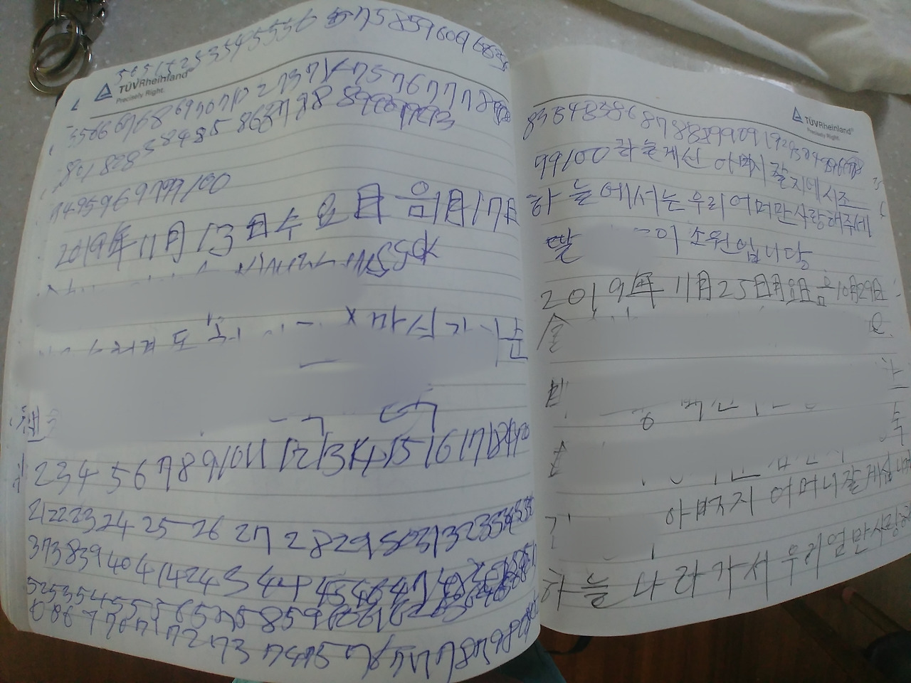 내용은 단순했다. 그날의 날짜. 그리고 1부터 100까지 숫자, 당신의 자식인 나와 동생의 이름, 본인 사위와 손자인나의 남편과 아들의 이름.