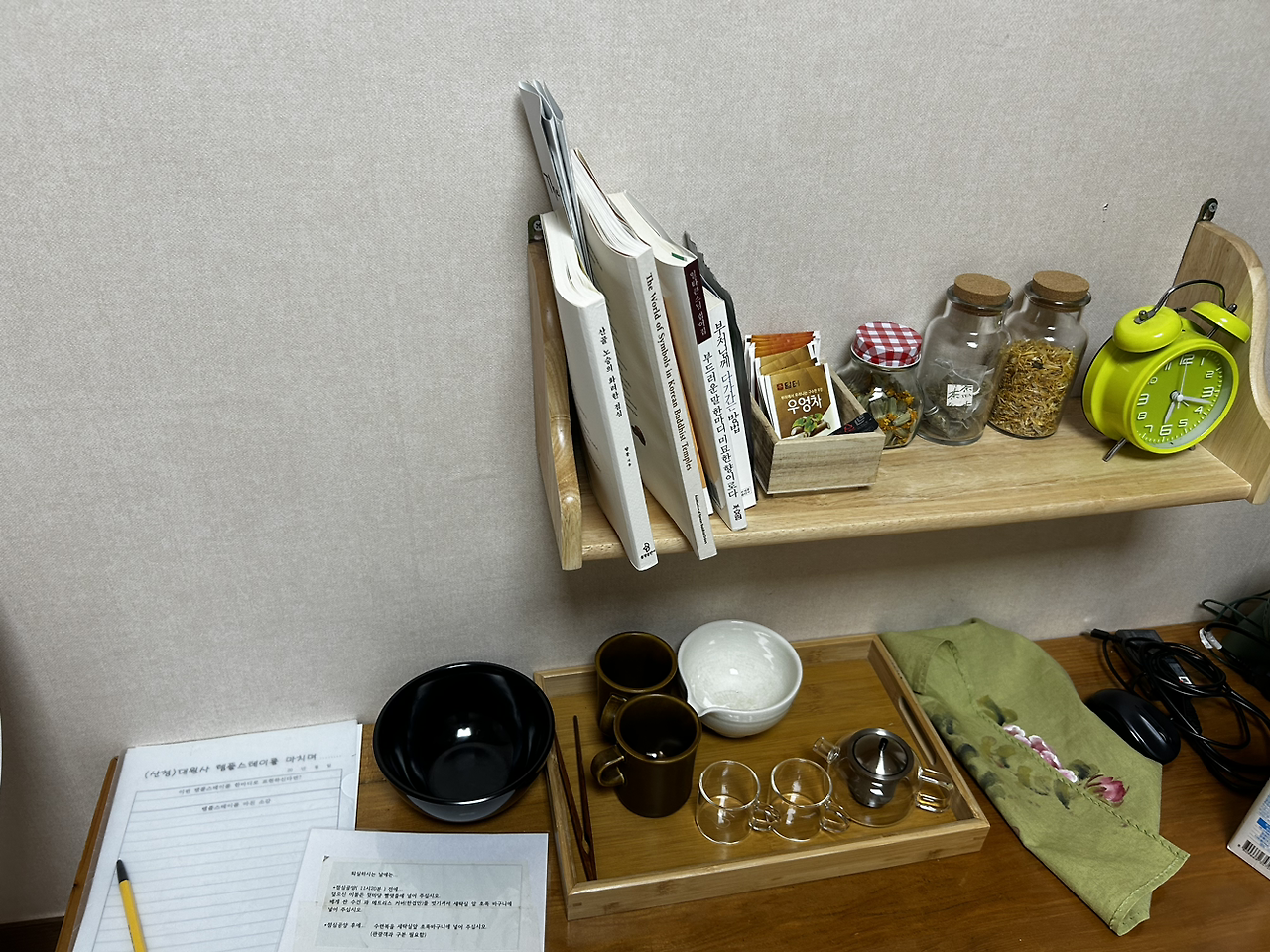 종교가 없는 우리에게 사실 종교 시설은 낯선 곳이었다. 그래서 은근히 걱정도 되었다. 기본도 모르는 사람들이 절에 가는 것이 예가 아닐까 봐. 하지만, 그곳에 도착하고 한 시간도 안되어 우리가 목적한 바의 대부분을 이루었다. 스님과의 차담에서였다. 스님은 템플스테이에 참여한 우리를 비롯한 일행을 보며 ' 사람들은 템플스테이를 하고, 생각보다 좋았다, 또는 별로였다'라고 하는데 왜 생각이란 걸 하고 와서 실망을 하는지 모르겠다. 아무 생각도 안 하고 오면 좋을 일도, 나쁠 일도 없을 것인데"라고 했다. 우리는 그 말을 이번 산청 여행 내내 하며 보냈다. 우리 부부 중 누가 투덜거릴 때마다 서로에게 이 말을 해줬다. 예를 들면, 첫날 오면서 먹은 식당 밥이 별로라는 말을 남편이 하자, 내가 "왜 그런 생각을 하냐, 어차피 다른 식당에서 먹었어도 일어날 일이었어." 하는 식이다.