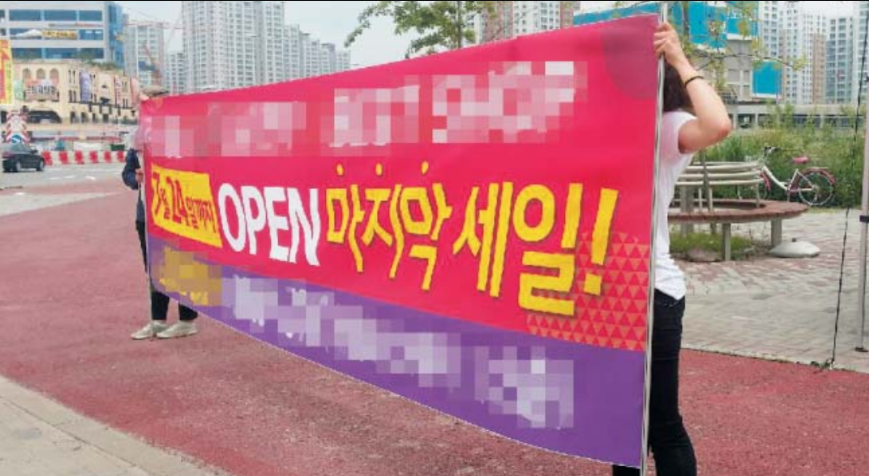 하지만, 며칠 전 집으로 오는 차 창 밖으로 본 것은 나의 소심함을 탓하기엔 많은 불편함을 느끼게 하였다. 그것은 소위 인간 현수막이라 불리는 것으로, 대로 한가운데서 두 사람이 커다란 현수막의 양쪽을 들고 서서 현수막의 내용을 홍보하는 것이다. 현수막을 든 그들도 그렇게 서 있는 것이 다소 난감한지, 혹은 지겨운지 한 손으로는 휴대폰을 보고 있고 다른 손으로는 현수막이 잘 펴질 수 있도록 당겨 잡고 있었다. 언젠가 뉴스에서 말하길, 이런 인간 현수막은 나무에 불법으로 매다는 것과 달리 법적으로 문제가 없고 인건비도 싼 편이라 점차 많이 나타나고 있는 현상이라고 하였다.
