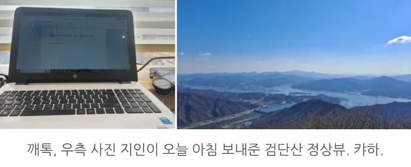 그간 너무 열심히 앞만 보고 달렸나 봐요. 몸이 안 좋아요. 어제 와 다른 눈 부시게 화창한 날. 지인은 내 마음 어찌 알고 검단산 멋진 경치를 보내줍니다.