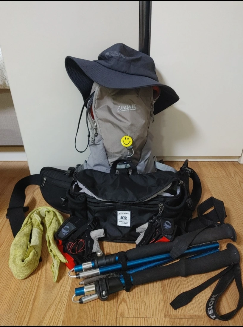 손수건, 모자, 등산 샌들, 스틱