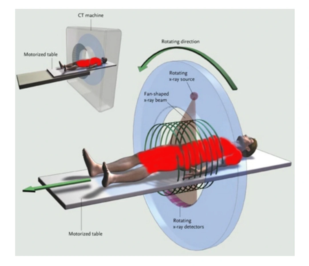 X선의 경우 진단 목적의 x선 촬영이나 CT(computed tomography) 촬영에 이용됩니다. 단순 X선 촬영의 경우 짧은 시간에 인체를 투과시킨 뒤, 이것을 필름에 감광시켜 영상을 얻게 됩니다. 인체의 각 부위에 의해 흡수되는 정도의 차이를 이용하여, 인체 내부의 단면을 이해할 수 있습니다. 일반적으로 밀도가 높은 조직에 흡수가 많이 되므로, 주로 뼈에 대한 구조를 확인하는데 많이 이용됩니다. 단순 x선 촬영을 사방팔방으로 인체 외부에서 촬영을 하고, 이것을 컴퓨터로 재구성하여, 인체 내부의 3차원적 구조를 볼 수 있게 해주는 것이 CT입니다. 수백 번의 단순 x선 촬영을 한 순간에 찍는 만큼 매우 높은 수준의 방사선이 인체에 가하게 됩니다. 따라서 불가피한 경우 외에는 CT는 일 년에 촬영 횟수가 제한됩니다.