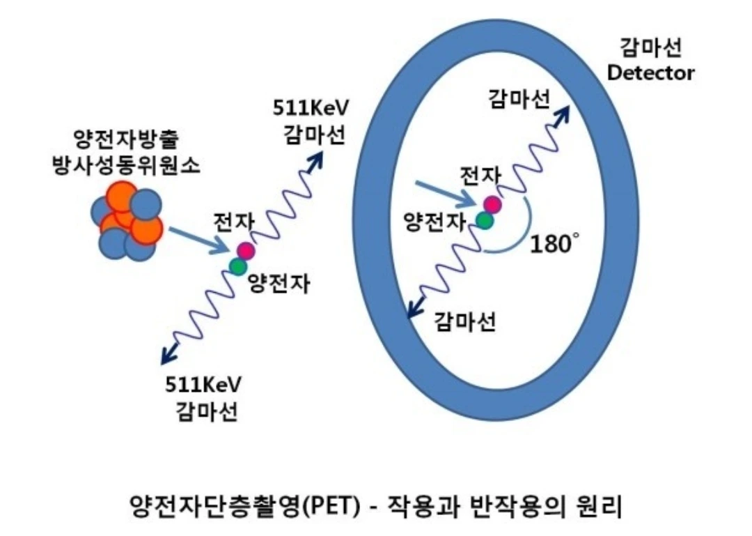감마선의 경우 진단 목적의 장비로서 PET(positron emission tomography)에서 이용되며, 치료 목적의 방사선 암 치료에 이용됩니다. PET은 쌍생성(pair production)이라는 양전자방출시에 발생하는 원자 수준에서의 반응에의 생성되는 180도 방향의 두 가지 0.511 MeV감마선을 측정함으로써 인체 내부구조를 3차원적으로 재구성한 영상기법입니다. 양전자를 방출하는 방사성동위원소를 환자에게 섭취하게 하고, 인체에 분포된 방사성동위원소의 위치를 PET 장비를 통해서 감지할 수 있습니다. 동위원소는 주로 암이 발생하거나 염증반응이 활발한 곳에 분포하게 되기 때문에, 이를 통해 암 진단에 큰 도움을 줄 수 있습니다.