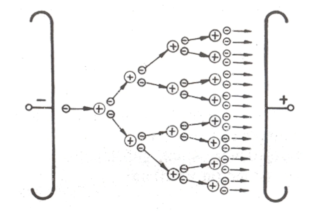 기체 내에서 이온화된 전자가 충분히 존재를 할 경우, 전자 자체가 이온화의 촉매가 됩니다. 매우 크기가 작으며 높은 운동에너지를 가진 전자가 사방팔방으로 운동을 하며, 다른 분자의 전자에 충돌을 통해 에너지를 전달하여 그 분자의 전자를 전리시킵니다. 이렇게 새롭게 생긴 전자는 수많은 다른 분자들을 이온화시키게 되며, 위 과정은 연쇄 과정을 통해 폭발적으로 일어나게 됩니다.