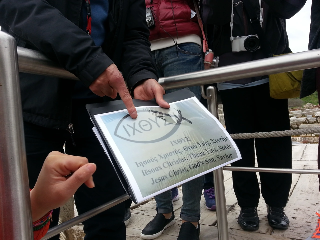 다음 목적지는 에페소스 유적. 고대 도시 중 하나로 크리스트교와도 관련이 깊다. 가이드의 설명에 따르면 크리스트교인들이 로마 시대 박해를 피해 자신이 크리스트교 인임을 나타내는 일종의 표식을 쓰게 되는데 그것이 물고기 모양이라고 했다. 그 안에 그리스어로 '익투스'라고 쓰여 있는데 이것은 '물고기'를 지칭할 뿐만 아니라 '예수 그리스도 하나님의 아들 구원자'라는 뜻도 있다고 한다. 그런데 이 곳 돌 위에 마치 피자 모양의 문양이 새겨져 있었는데 자세히 보면 '익투스'의 그리스어가 다 들어가 있다고 했다. 참 흥미로웠다. 터키는 고대 시대 크리스트교와 관련된 도시가 많아 이전부터 관심이 있었는데(내가 기독교인이라서) 이렇게 설명을 듣고 눈으로 보니 더욱더 마음에 와 닿았다.