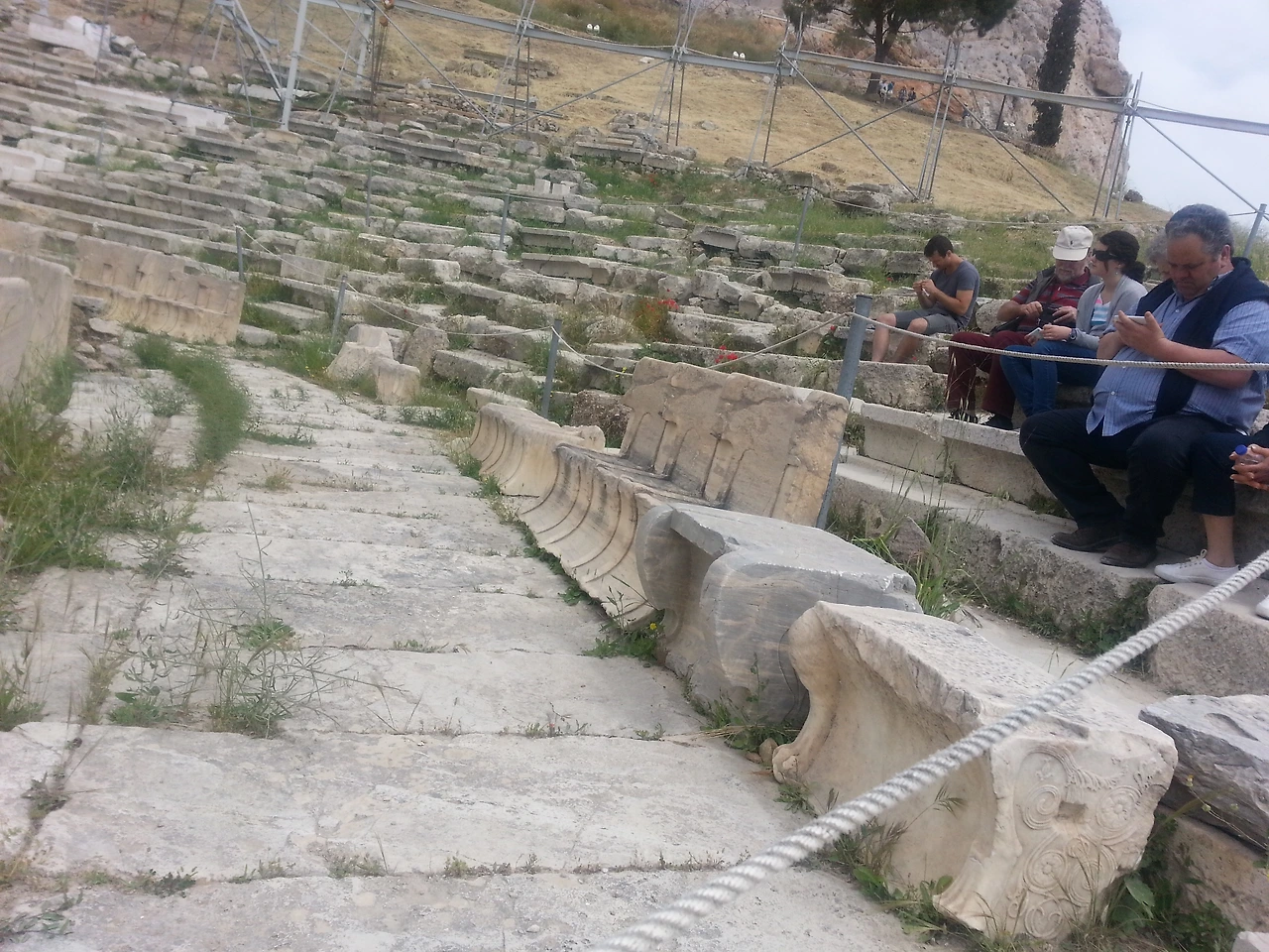 오래지 않아 가는 길목엔 디오니소스 극장이 있었다. 터키 지방 투어 때 고대 극장을 두 번 봤던 터라 감흥은 덜했지만 돌 의자에 앉아 괜히 한번 기분을 내봤다. 의자의 아랫부분은 약간 홈이 들어가 있는 형태라 다리를 살짝 넣을 수 있게 만들었다는 터키 가이드님의 말이 생각나기도 했다. 올라가는 도중에는 군데군데 돌들이 널려있는 것들이 있었는데 복원 중인 것도 있고 옛 터에 그대로 남아있는 돌들도 있었다.