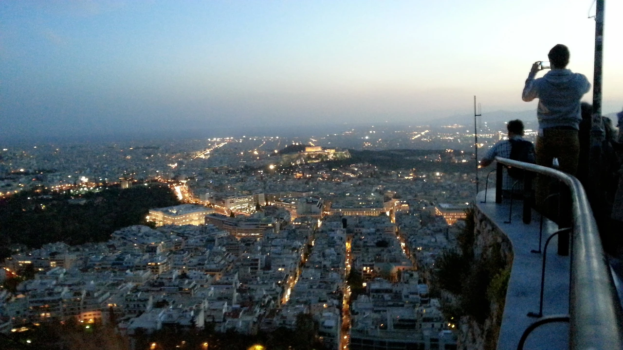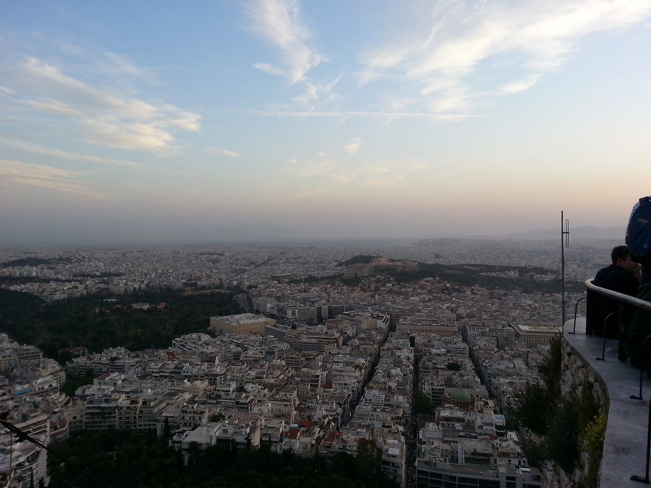 이미 자리를 잡고 앉아있는 사람들 틈을 겨우 비집고 들어가니 아테네 시내가 한눈에 다 보인다. 우리는 감탄사를 내뱉으며 눈앞에 있는 광경을 한참 바라보았다. 저 멀리 파르테논 신전도 있고, 아득히 먼 곳에는 바다도 보인다. 산과 언덕 사이사이로 빼곡하게 들어선 건물들이 약간 답답해 보이기도 했지만 탁 트인 전경과 약간은 쌀쌀한 바람이 그런 생각들을 금방 씻어간다.