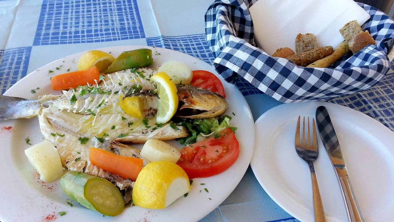 점심은 바다를 바라보며 제대로 먹어보고 싶었다. 바다 근처 괜찮아 보이는 레스토랑에 들어갔다. 식탁보를 보니 그리스에 온 게 비로소 실감이 난다. 어촌마을이라 왠지 생선이 싱싱하고 맛있을 것 같아 생선요리를 주문했다. 음식을 받고 보니 상상했던그리스 요리 비주얼이다. 생선살을 한점 먹어봤다.