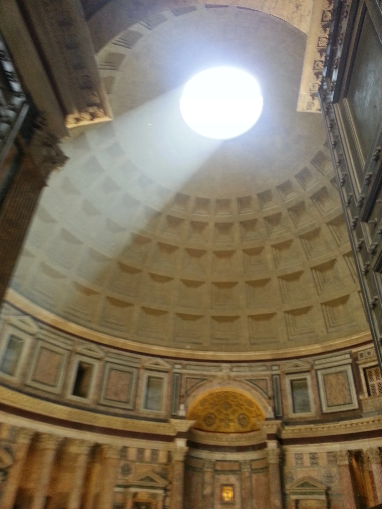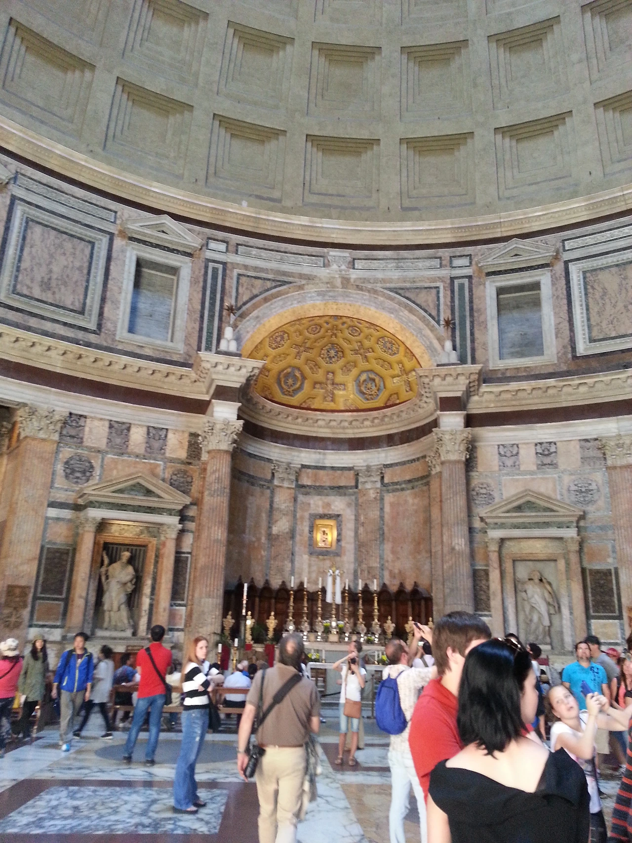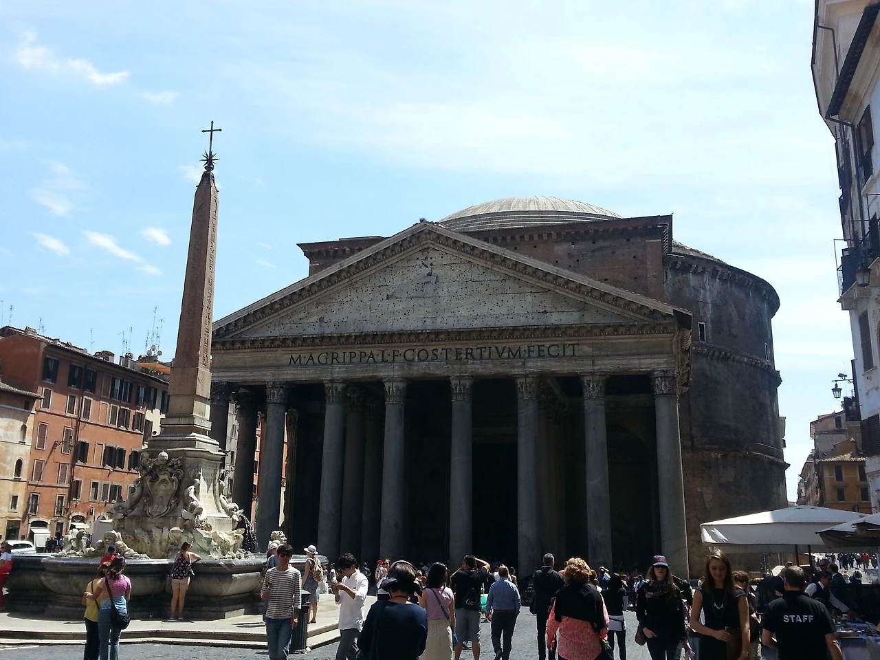 점심식사 후 식당 바로 앞에 있던 약 이천 년 전 지어진 판테온을 보러 갔다. 이곳은신전으로 만들어진 곳이다. 외관만 봐서는 뭔가 단단하고 견고한 요새같이 어두컴컴하게 생겼는데 안으로 들어가니 천장에서 들어오는 햇빛으로 인해 매우 밝았다.내부는 성당 분위기가 물씬 풍긴다. 천장을 돔 형식으로 지었는데 중앙에 받쳐주는 기둥 없이 이것을 완성했다는 건 당시의 건축기술이 대단했음을 보여주는 것이라 한다. 이렇게 유럽여행을 하면서 이천 년 정도 되는 건물들을 몇 개 보다 보니 이제 몇백 년 된 건물은 그저 그렇게 느껴진다. 유럽 고대사의 본고장인 그리스와 로마를 지나와서 그런가 보다.