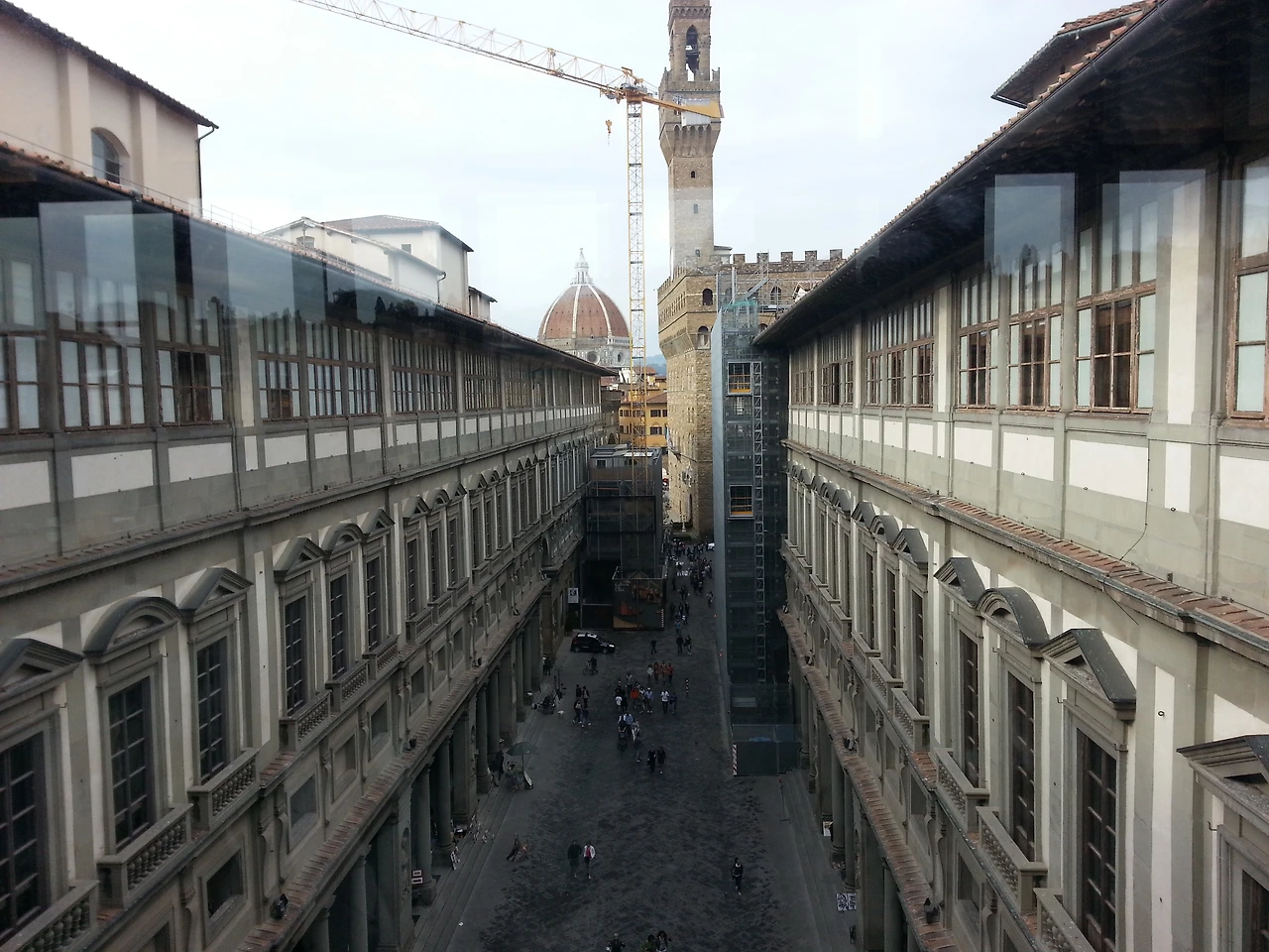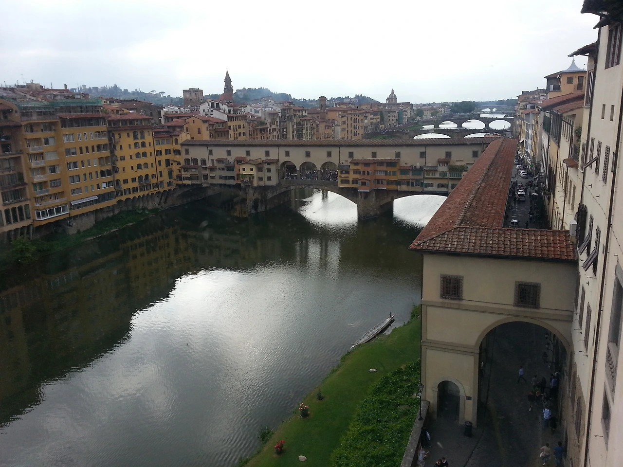 시간이 좀 더 흐르자 몸이 천근만근이 되었다. 이 와중에 창밖을 빼꼼 내다보니 저 멀리 두오모 쿠폴라가 보인다. 그래 저길 내가 오늘 아침에 올라갔었지. 다른 쪽 창문으로는 피렌체의 대표적 명소인 베끼오 다리가 있다. 여러 개의 상점을 가지고 있는 독특한 다리인데 오늘은 너무 힘들어 내일 자세히 둘러보기로 했다.