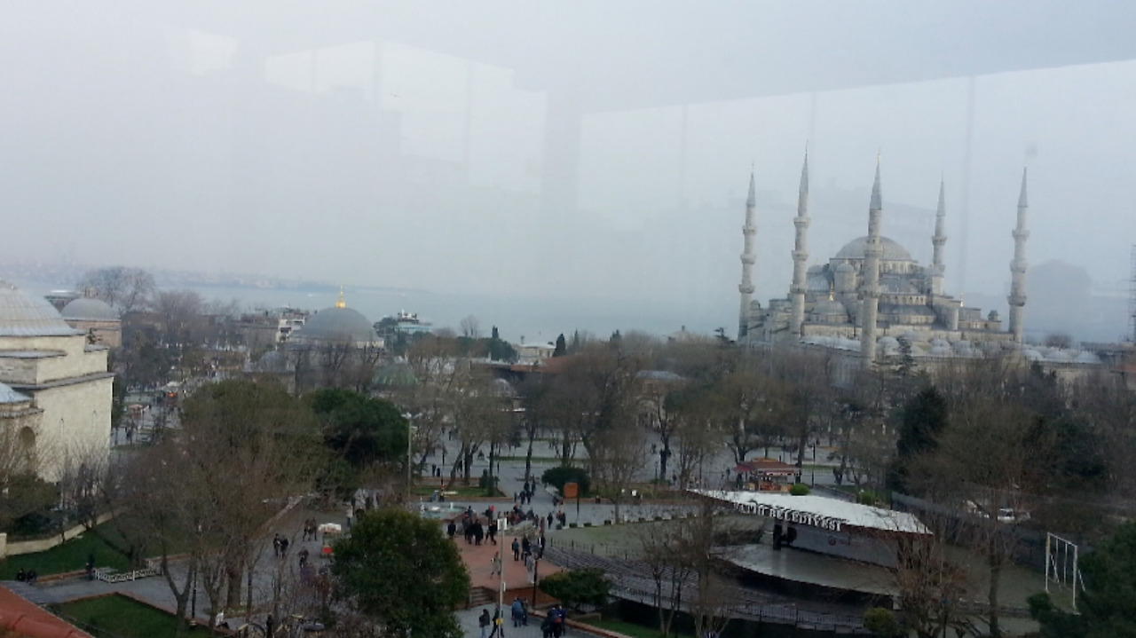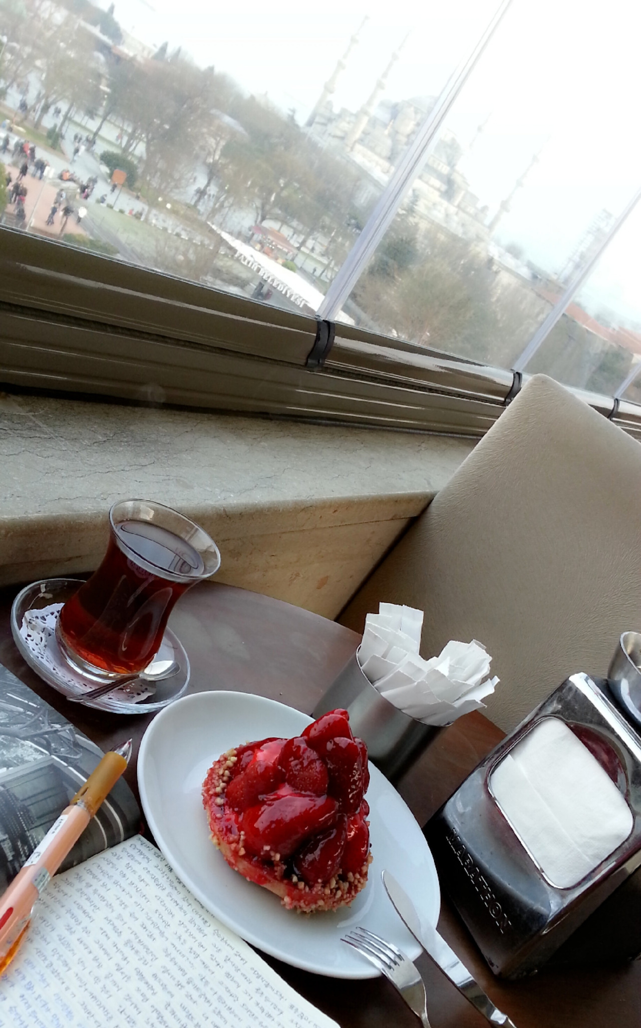 홍차와 딸기 타르트를 주문했다. 홍차 잔에 손잡이가 없는 것은 뜨거울 때는 손을 데일 수 있으니 먹지 말라는 일종의 배려라고 들었는데 약간 추웠던 나는 아랑곳없이 뜨거운 홍차를 연신 홀짝였다. 창밖으로는 블루 모스크가 한눈에 들어왔고, 흐린 구름 사이로 해가 뉘엿뉘엿 지고 있었다.