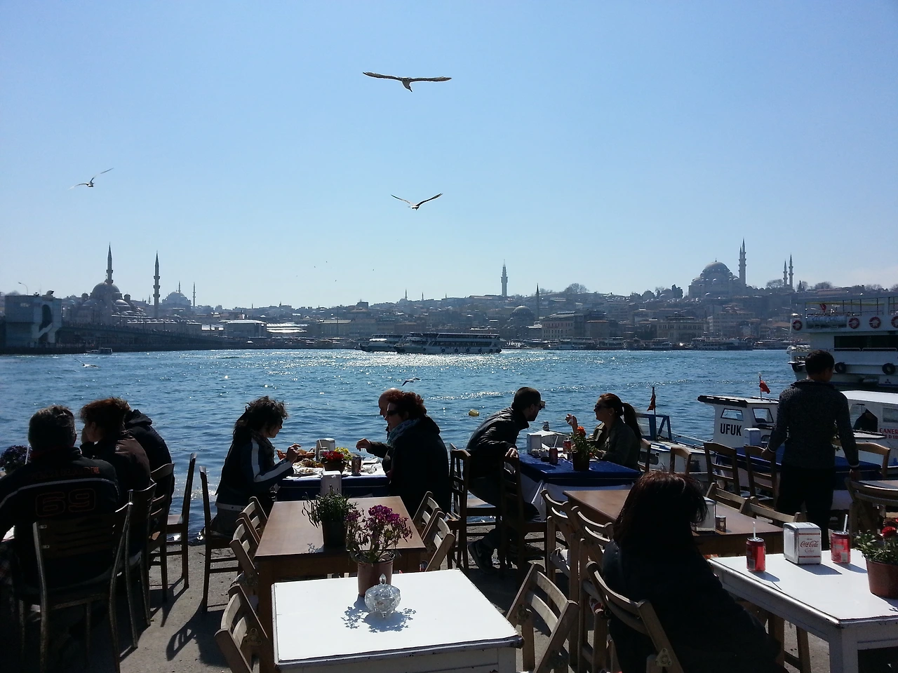 투어 첫날 먹었던 고등어 케밥과 석류+오렌지 착즙주스를 사서 테이블에 앉았다.(주스가 너무 맛있어서 숙소에 가서 먹으려고 가져간 텀블러에 한잔 더 사서 넣었다.) 주위를 둘러보니 천국이 따로 없다. 멀리 술레이만 사원이 보이고, 각종 유람선, 페리 그리고 하늘을 나는 갈매기, 짙은 파랑의 바다까지... 내가 유럽에 있음을 온몸으로 느끼게 해 주었다. 고등어 케밥은 두 번째 먹으니 더 맛있다. 비린내도 안 나고 무엇보다 소스 맛이 일품이다. 반짝이는 햇살 속에 시원한 바닷바람을 맞으며 맛있는 것을 먹는 기분은 정말 끝내줬다. 가지고 간 선글라스도 한껏 추켜올리며 나름의 호사를 신나게 누렸다. 이 순간이 참 감사했다. 다 먹고 돌아가는 길엔 홍합밥을 2개 더 사 먹었다.
