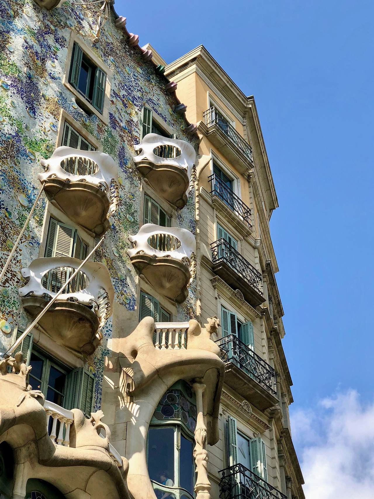 카사 바트요는 가우디가 사업가 바트요의 의뢰로 설계한 1907년 작품으로 이 건물의 메인 테마는 지중해 ‘바다’다. 바깥은 물결 치는 바다를, 내부는 바닷속을 표현했다고 한다. 길 건너 오르막에는 카사 밀라가 나타난다. 이 작품은 1910년에 만들어진 것으로 이 메인 테마는 ‘산’이다. 투구를 쓴 것 같은 옥상 굴뚝이 인상적인 건물. 교차로를 사이로 대각선으로 마주한 두 건물이 각각 산과 바다를 테마로 했다니 절묘한 균형이라고 하지 않을 수 없다. 보통의 건물에서 취하는 직선을 찾아보기 힘들 정도로 굴곡진 곡선의 우아함과 부드러움에 누구나 첫눈에 반하고 만다.