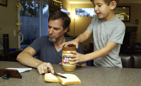 “아니, 아빠~ 칼에다 땅콩버터를 묻혀서 빵에 문지르라고!”