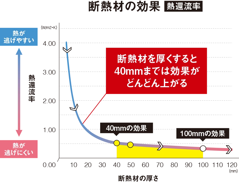 단열성이 좋은 집은 어떻게 만들 수 있을까? 그것은 단열재 종류와 두께에 의해서 결정된다. 어떤 단열재도 두껍게 하면 좋지만 두껍게 하면 할수록 비용은 기하급수적으로 늘어나는 반면, 단열성능의 증가폭은 줄어든다.